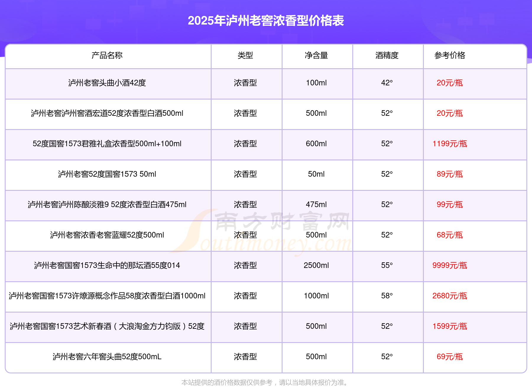 2025年,瀘州老窖濃香型酒價格最高的是瀘州老窖國窖1573春釀鼠兆豐年E 55度,參考價17999元,最低的是瀘州老窖45度五洲醉8窖經(jīng)典小酒版濃香型100ml,參考價10元,價格高低差為17989元。