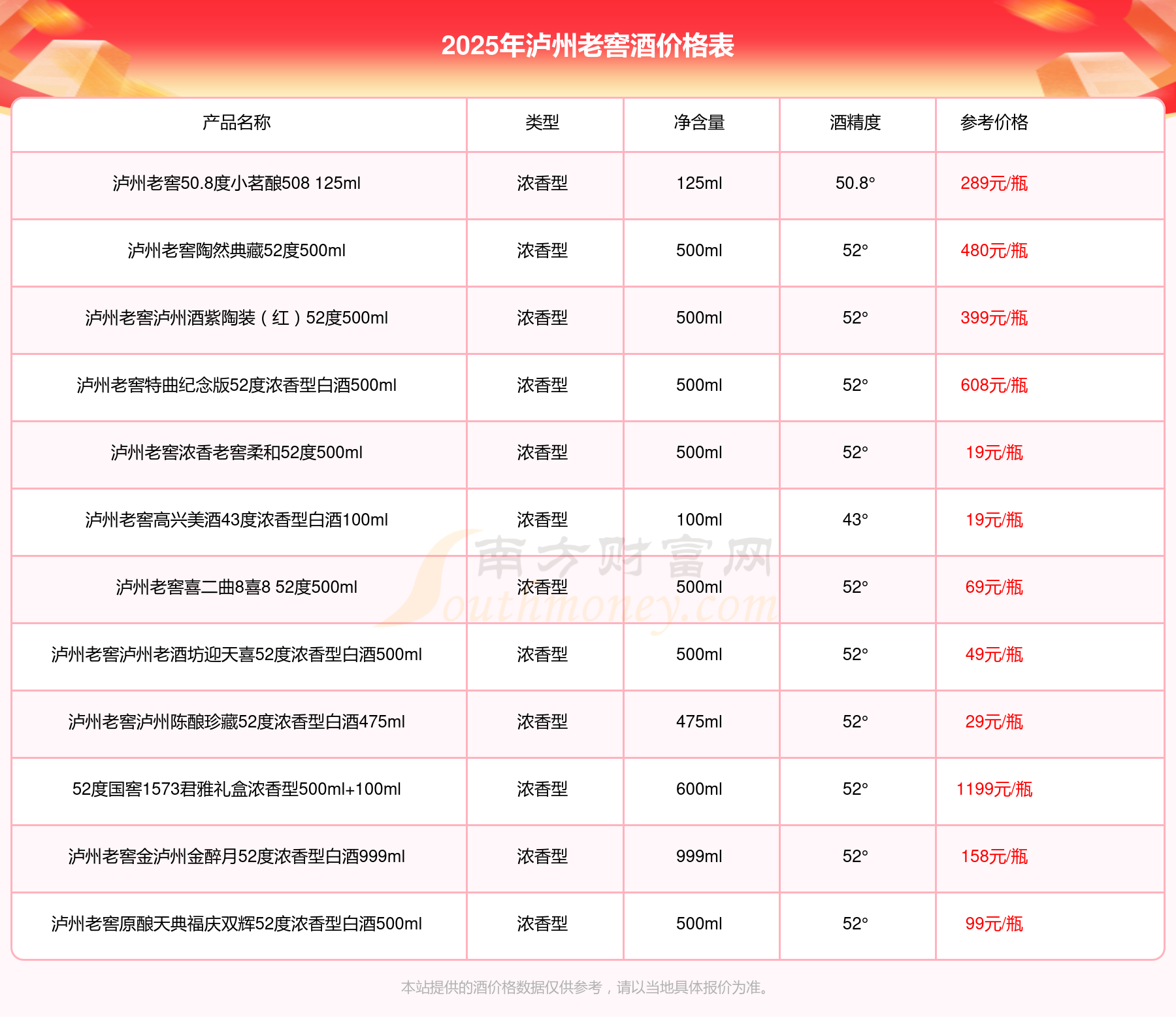 2025年,瀘州老窖國(guó)窖1573春釀鼠兆豐年E 55度、瀘州老窖國(guó)窖1573生命中的那壇酒55度014、瀘州老窖國(guó)窖1573春釀鼠兆豐年A 55度、瀘州老窖國(guó)窖1573生命中的那壇酒55度013濃香型白酒1000ml、瀘州老窖國(guó)窖1573生命中的那壇酒55度009 1000ml、瀘州老窖國(guó)窖1573中國(guó)品味52度濃香型白酒500ml、瀘州老窖國(guó)窖1573許燎源概念作品58度濃香型白酒1000ml、瀘州老窖52度國(guó)窖1573狗年生肖禮盒等瀘州老窖酒價(jià)格如下:瀘州老窖國(guó)窖1573春釀鼠兆豐年E 55度參考價(jià)17999元/瓶、瀘州老窖國(guó)窖1573生命中的那壇酒55度014參考價(jià)9999元/瓶、瀘州老窖國(guó)窖1573春釀鼠兆豐年A 55度參考價(jià)5088元/瓶、瀘州老窖國(guó)窖1573生命中的那壇酒55度013濃香型白酒1000ml參考價(jià)4988元/瓶、瀘州老窖國(guó)窖1573生命中的那壇酒55度009 1000ml參考價(jià)4288元/瓶、瀘州老窖國(guó)窖1573中國(guó)品味52度濃香型白酒500ml參考價(jià)2888元/瓶、瀘州老窖國(guó)窖1573許燎源概念作品58度濃香型白酒1000ml參考價(jià)2680元/瓶、瀘州老窖52度國(guó)窖1573狗年生肖禮盒參考價(jià)2143元/瓶。