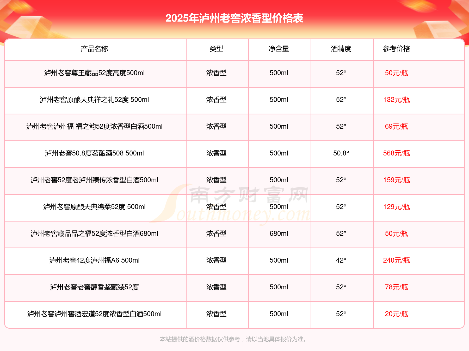 2025年,瀘州老窖國窖1573春釀鼠兆豐年E 55度、瀘州老窖國窖1573生命中的那壇酒55度014、瀘州老窖國窖1573春釀鼠兆豐年A 55度等瀘州老窖濃香型酒價(jià)格如下: