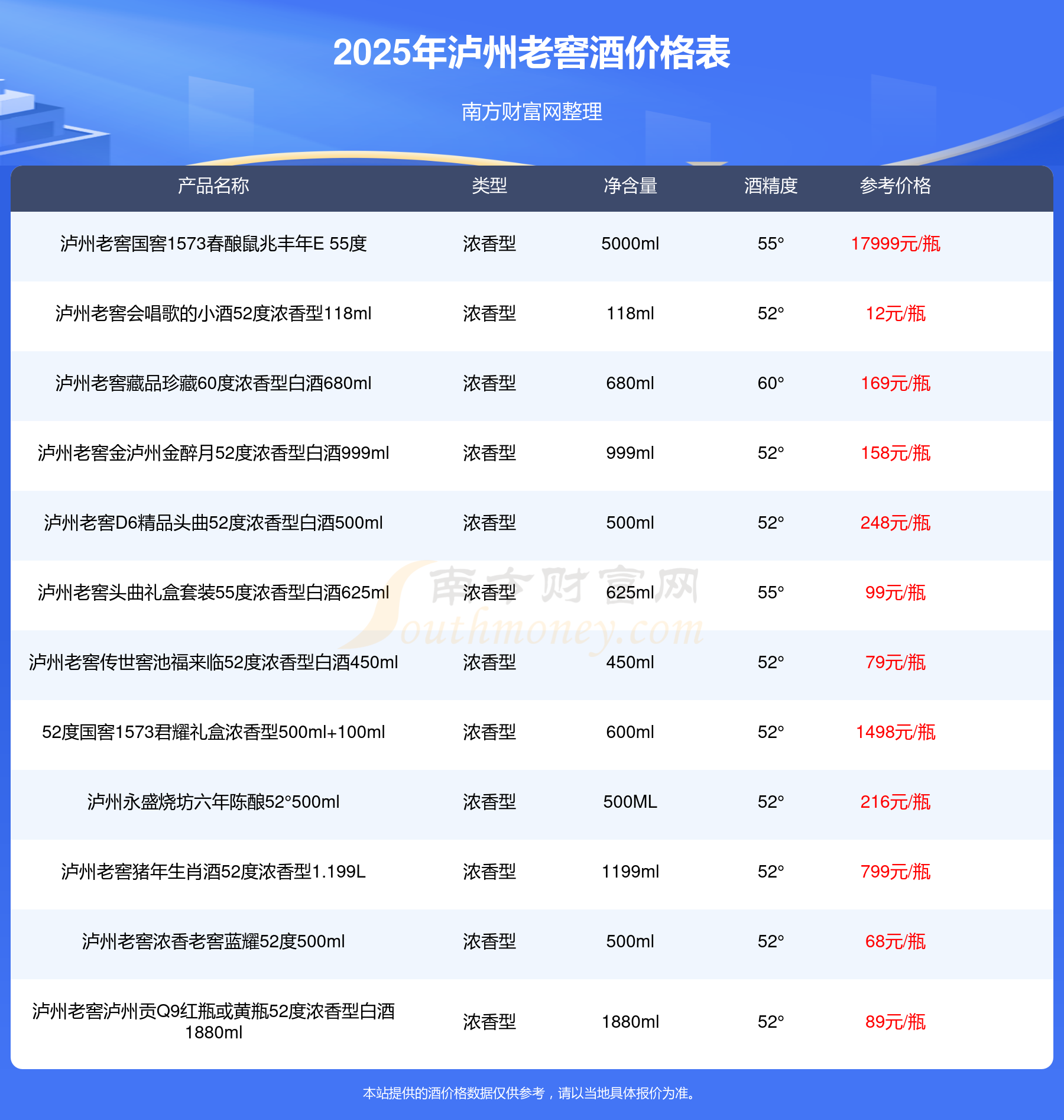 瀘州老窖國窖1573春釀鼠兆豐年E 55度參考價17999元/瓶、瀘州老窖國窖1573生命中的那壇酒55度014參考價9999元/瓶、瀘州老窖國窖1573春釀鼠兆豐年A 55度參考價5088元/瓶、瀘州老窖國窖1573生命中的那壇酒55度013濃香型白酒1000ml參考價4988元/瓶、瀘州老窖國窖1573生命中的那壇酒55度009 1000ml參考價4288元/瓶、瀘州老窖國窖1573中國品味52度濃香型白酒500ml參考價2888元/瓶。