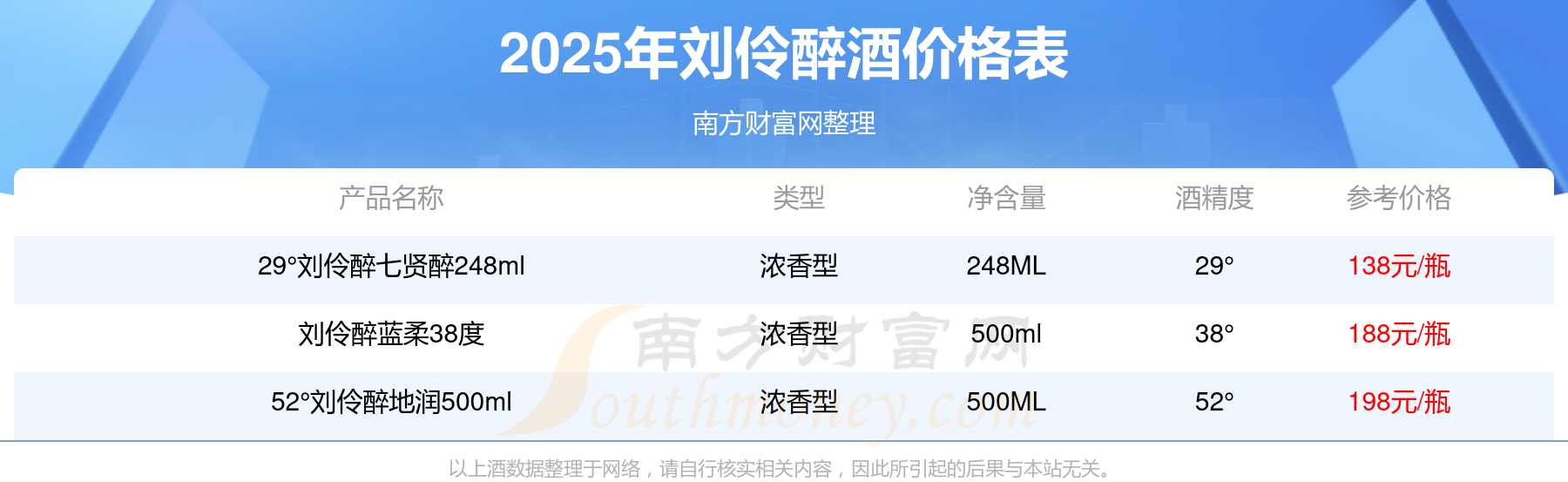 2025劉伶醉酒最新價(jià)格:52°劉伶醉地潤500ml參考價(jià)198元/瓶、劉伶醉藍(lán)柔38度參考價(jià)188元/瓶、29°劉伶醉七賢醉248ml參考價(jià)138元/瓶。