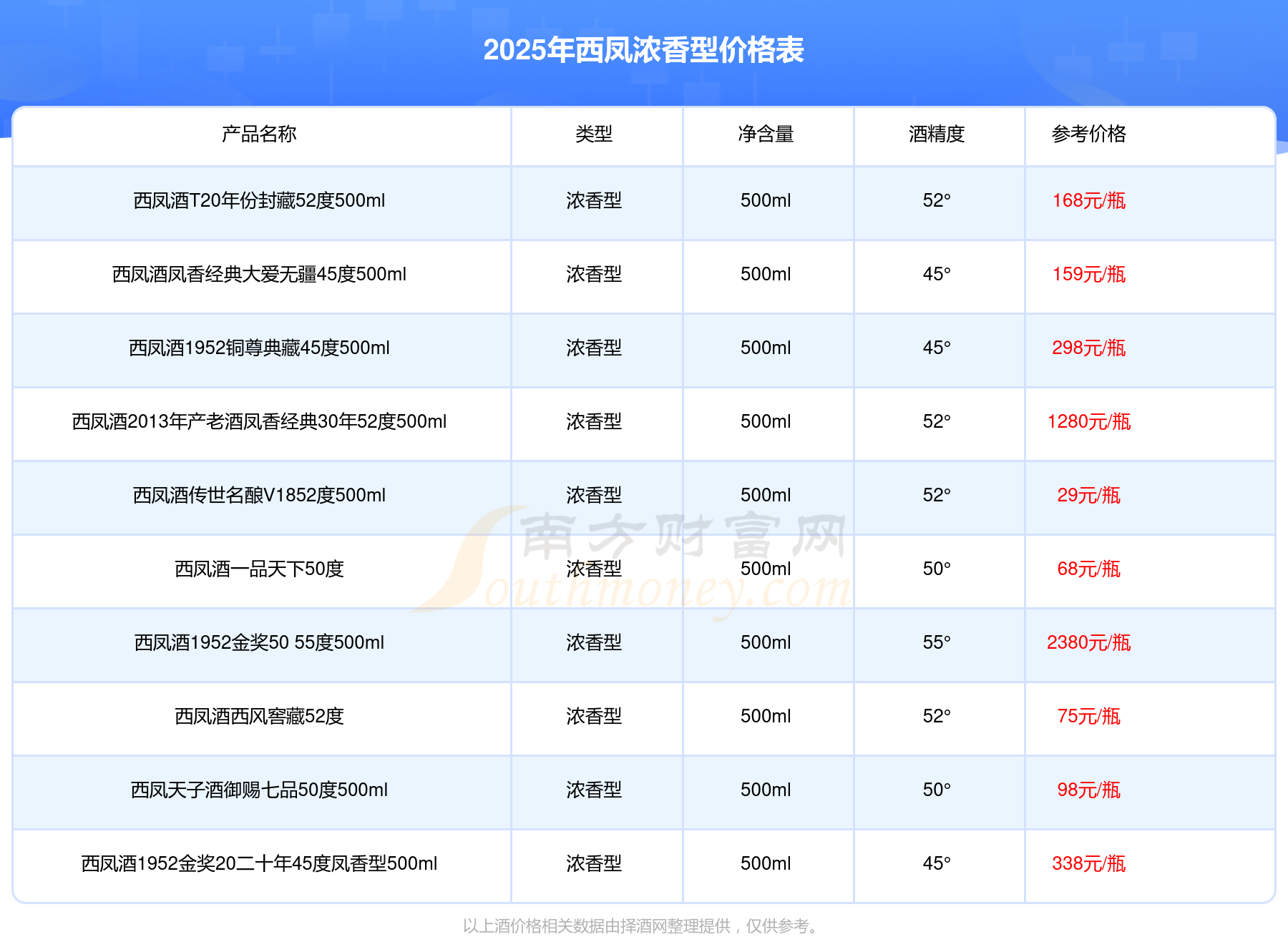 西鳳濃香型酒價(jià)格最高的是西鳳酒 酒海私藏55度3000ml,參考價(jià)8880元/瓶,最低的是西鳳酒傳世名釀V1852度500ml,參考價(jià)29元/瓶,價(jià)格高低差為8851元/瓶。
