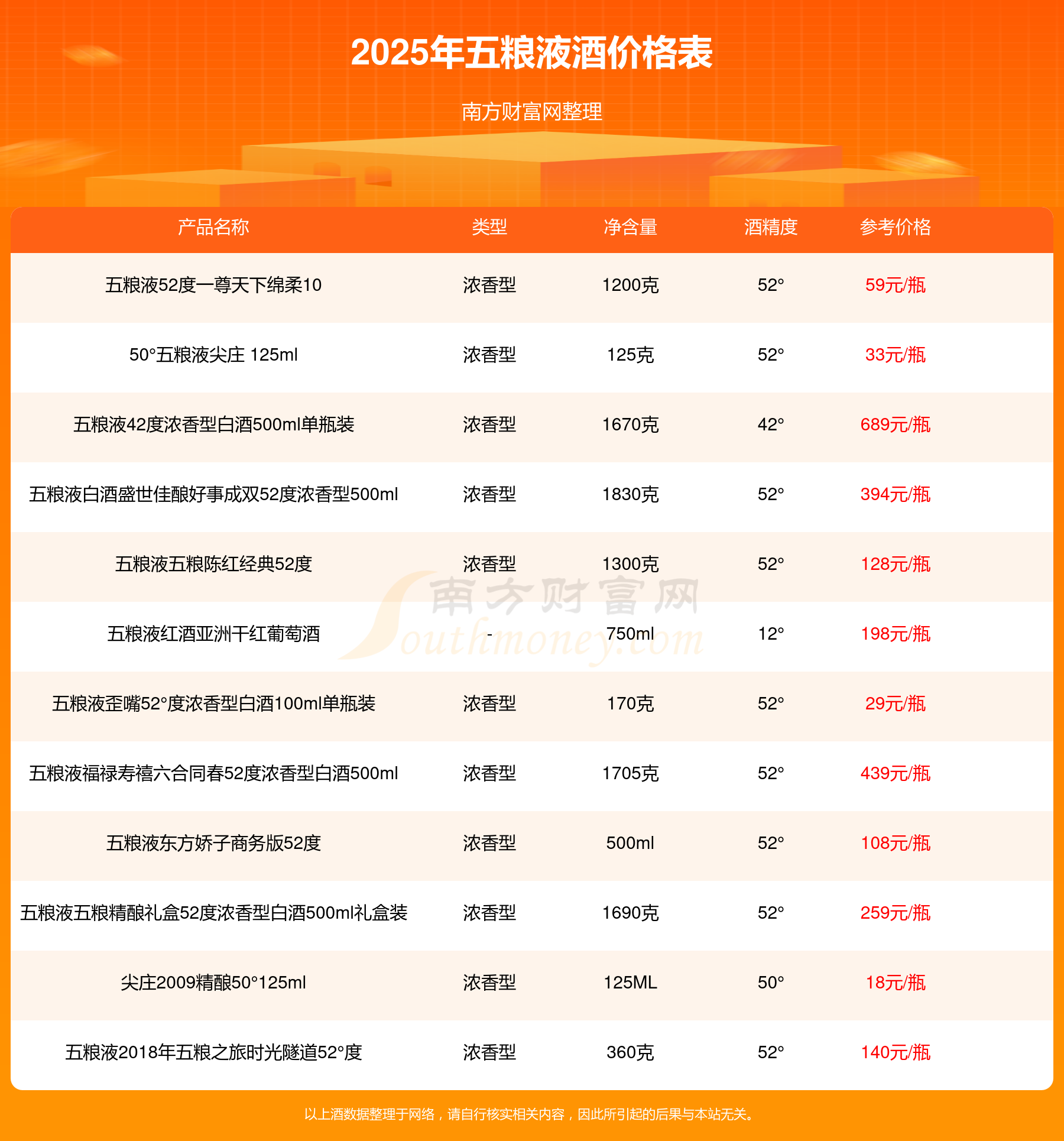 2025年五糧液價格最高的酒是五糧液百年世博世紀榮耀紀念酒60°999ml,參考價26980元/瓶,最低的是五糧液干一杯小瓶46度,參考價16元/瓶,價格高低差為26964元/瓶。