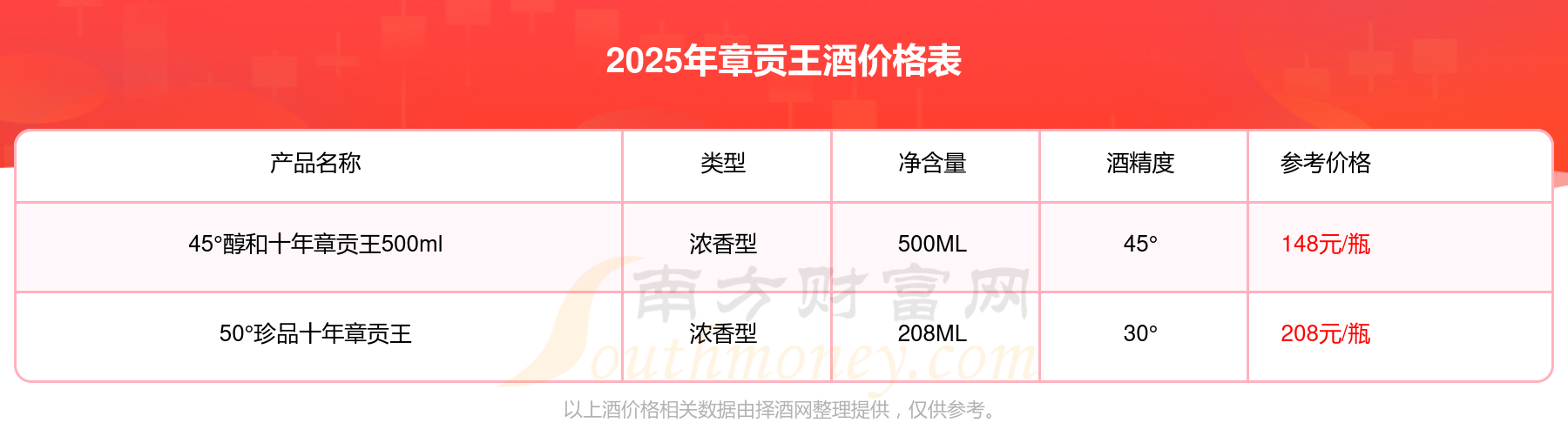 章貢王酒最新價格2025:50°珍品十年章貢王參考價208元/瓶、45°醇和十年章貢王500ml參考價148元/瓶。
