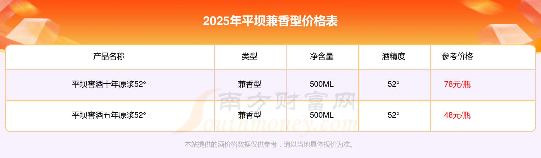2025平壩兼香型酒最新價格:平壩窖酒十年原漿52°參考價78元/瓶、平壩窖酒五年原漿52°參考價48元/瓶。