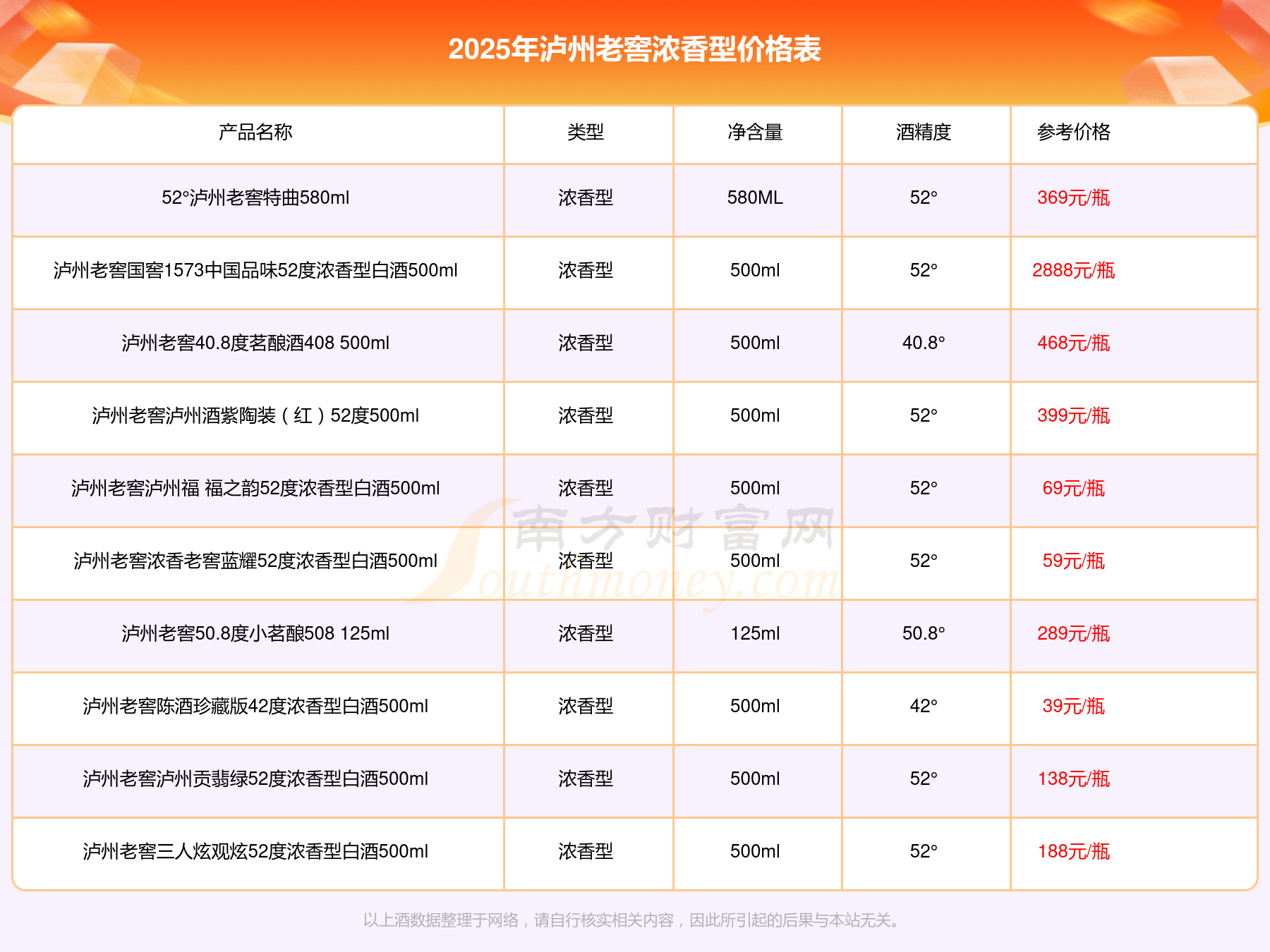 瀘州老窖國(guó)窖1573春釀鼠兆豐年E 55度參考價(jià)17999元/瓶、瀘州老窖國(guó)窖1573生命中的那壇酒55度014參考價(jià)9999元/瓶、瀘州老窖國(guó)窖1573春釀鼠兆豐年A 55度參考價(jià)5088元/瓶、瀘州老窖國(guó)窖1573生命中的那壇酒55度013濃香型白酒1000ml參考價(jià)4988元/瓶、瀘州老窖國(guó)窖1573生命中的那壇酒55度009 1000ml參考價(jià)4288元/瓶。