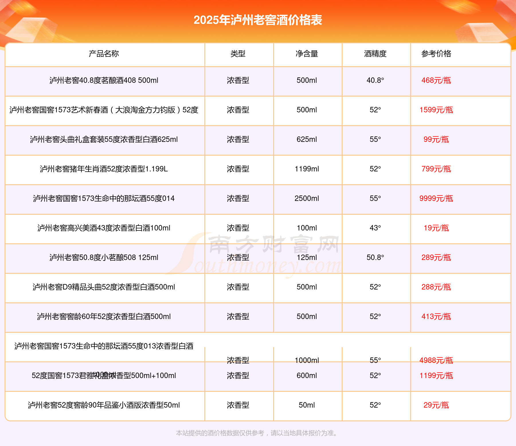 2025年,瀘州老窖國窖1573春釀鼠兆豐年E 55度、瀘州老窖國窖1573生命中的那壇酒55度014、瀘州老窖國窖1573春釀鼠兆豐年A 55度、瀘州老窖國窖1573生命中的那壇酒55度013濃香型白酒1000ml、瀘州老窖國窖1573生命中的那壇酒55度009 1000ml、瀘州老窖國窖1573中國品味52度濃香型白酒500ml、瀘州老窖國窖1573許燎源概念作品58度濃香型白酒1000ml等瀘州老窖酒價(jià)格如下: