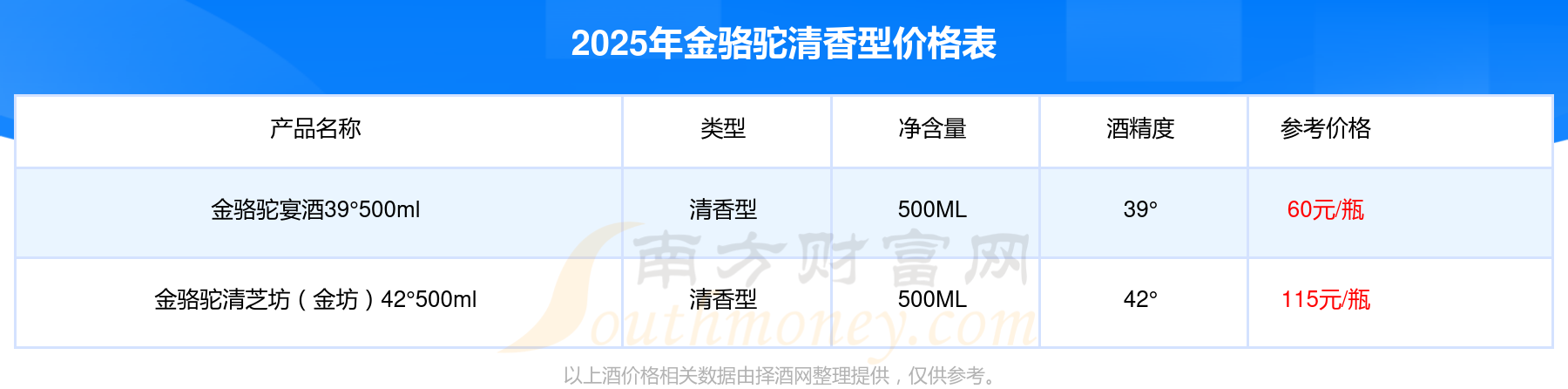 2025年,金駱駝清芝坊(金坊)42°500ml、金駱駝宴酒39°500ml等金駱駝清香型酒價格如下:金駱駝清芝坊(金坊)42°500ml參考價115元/瓶、金駱駝宴酒39°500ml參考價60元/瓶。