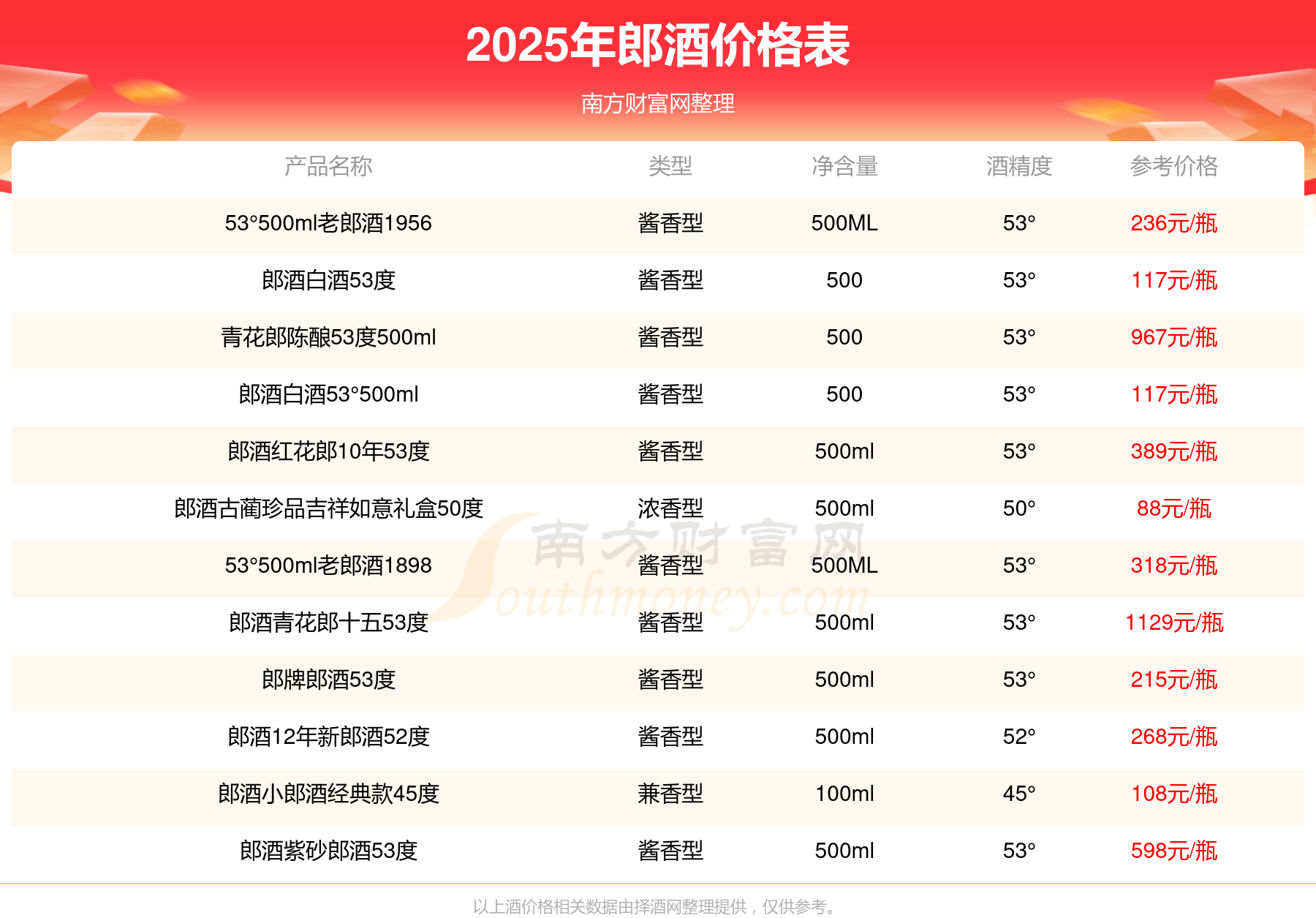 郎酒青花郎十五53度參考價(jià)1129元/瓶、青花郎陳釀53度500ml參考價(jià)967元/瓶、郎酒紫砂郎酒53度參考價(jià)598元/瓶、郎酒紅花郎10年53度參考價(jià)389元/瓶。