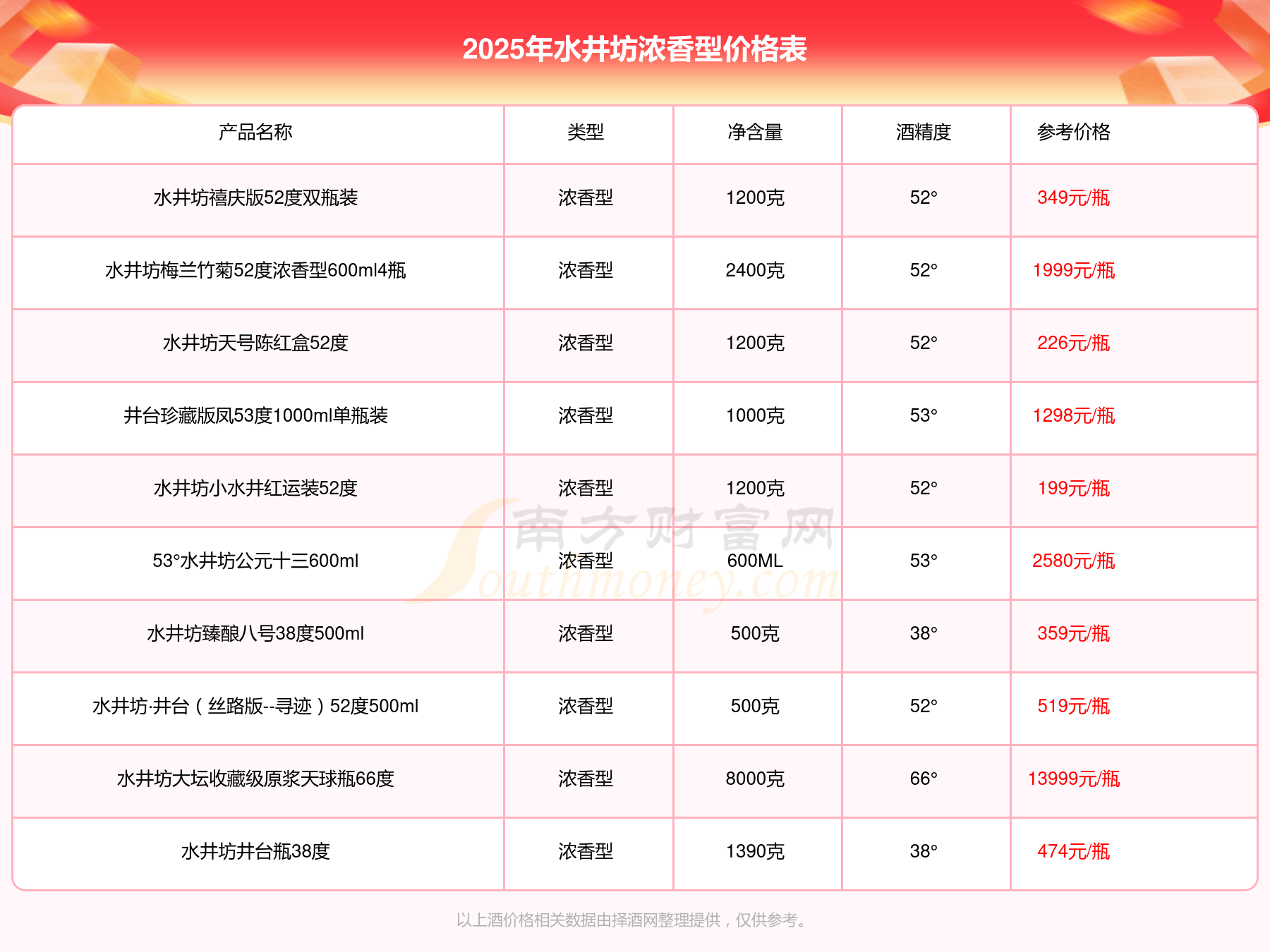 2025年水井坊濃香型酒水井坊大壇收藏級原漿天球瓶66度、水井坊博物館壹號53度雙瓶裝、53°水井坊公元十三600ml、水井坊梅蘭竹菊52度濃香型600ml4瓶、水井坊菁翠52度500ml、井臺珍藏版龍53度1000ml單瓶裝等最新價(jià)格如下: