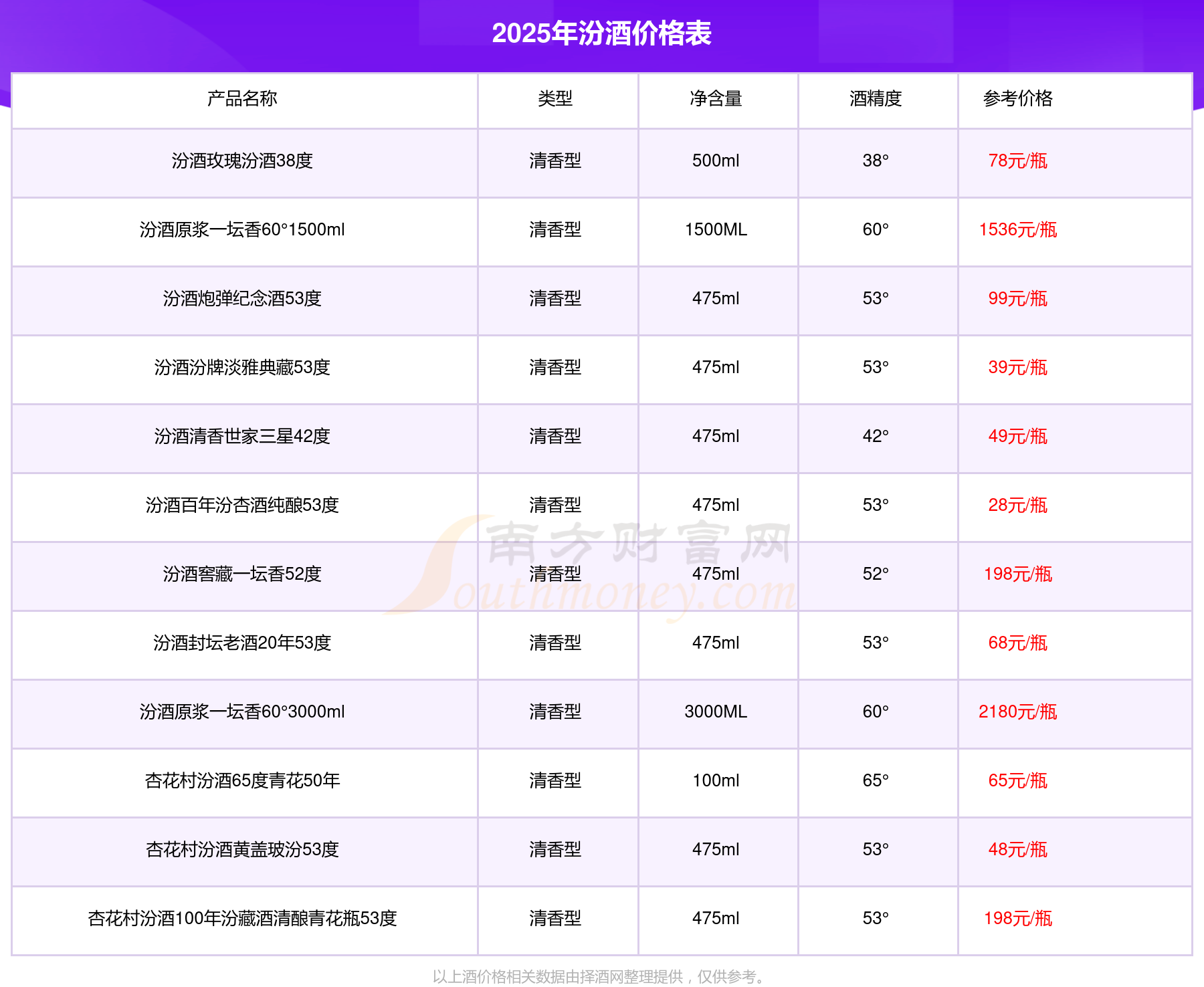 2025年,汾酒原漿一壇香60°3000ml、汾酒原漿一壇香60°1500ml、42度汾酒青花25、汾酒收藏系列盤古汾酒55度、汾酒關(guān)照原漿60度、汾酒青花20單瓶禮盒裝、汾酒海峽情42度等汾酒價(jià)格如下:汾酒原漿一壇香60°3000ml參考價(jià)2180元/瓶、汾酒原漿一壇香60°1500ml參考價(jià)1536元/瓶、42度汾酒青花25參考價(jià)598元/瓶、汾酒收藏系列盤古汾酒55度參考價(jià)400元/瓶、汾酒關(guān)照原漿60度參考價(jià)399元/瓶、汾酒青花20單瓶禮盒裝參考價(jià)388元/瓶、汾酒海峽情42度參考價(jià)218元/瓶。