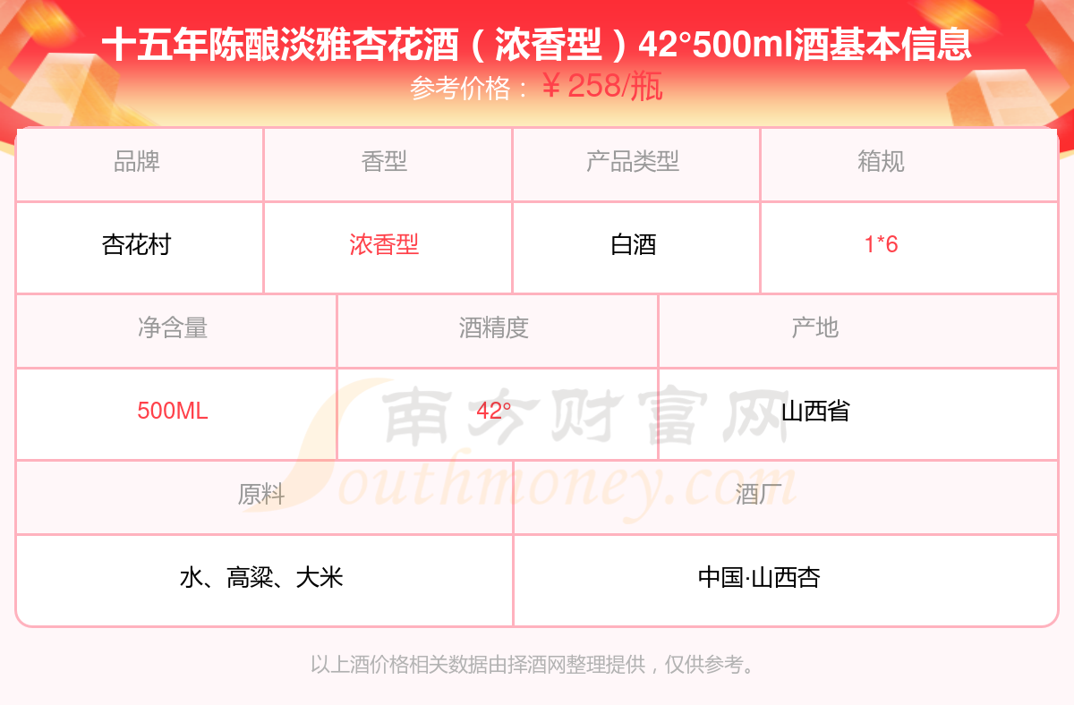 十五年陳釀淡雅杏花酒(濃香型)42°500ml基本信息