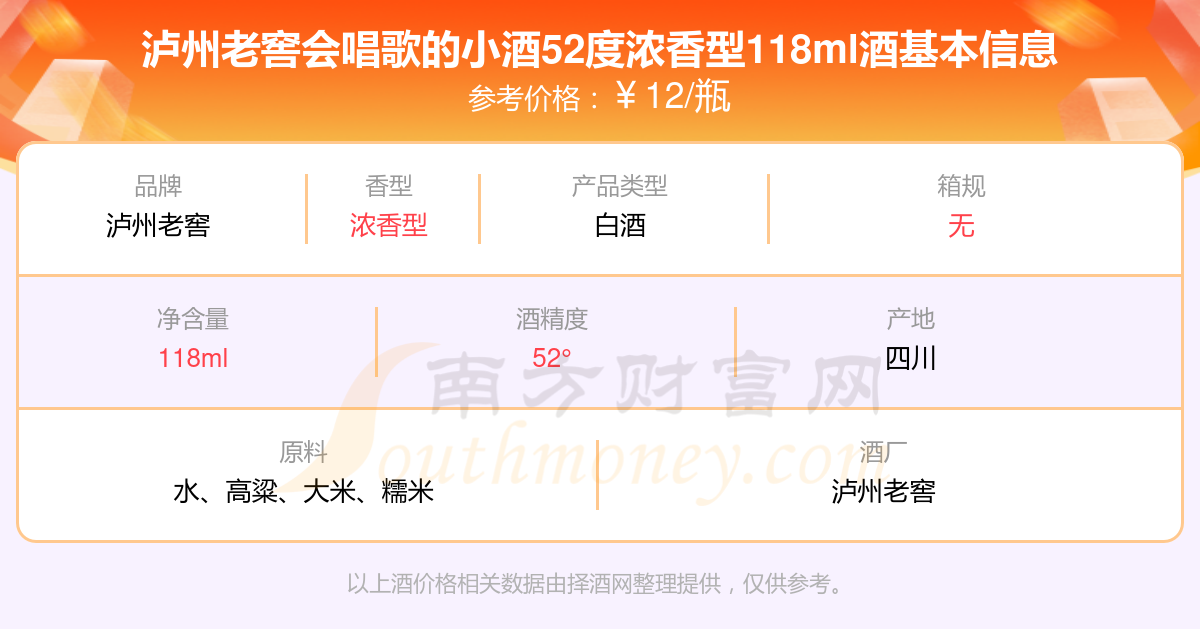 瀘州老窖會唱歌的小酒52度濃香型118ml基本信息