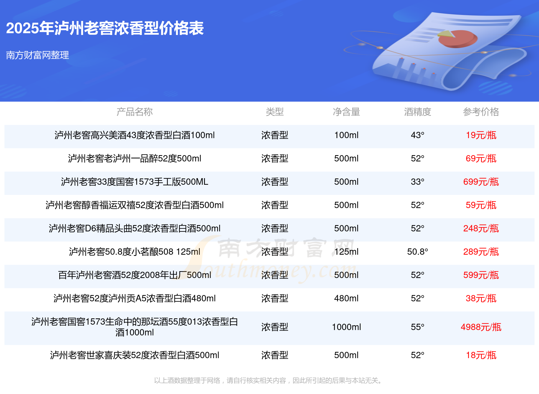 2025瀘州老窖濃香型酒最新價(jià)格:瀘州老窖國(guó)窖1573春釀鼠兆豐年E 55度參考價(jià)17999元/瓶、瀘州老窖國(guó)窖1573生命中的那壇酒55度014參考價(jià)9999元/瓶、瀘州老窖國(guó)窖1573春釀鼠兆豐年A 55度參考價(jià)5088元/瓶、瀘州老窖國(guó)窖1573生命中的那壇酒55度013濃香型白酒1000ml參考價(jià)4988元/瓶、瀘州老窖國(guó)窖1573生命中的那壇酒55度009 1000ml參考價(jià)4288元/瓶、瀘州老窖國(guó)窖1573中國(guó)品味52度濃香型白酒500ml參考價(jià)2888元/瓶。