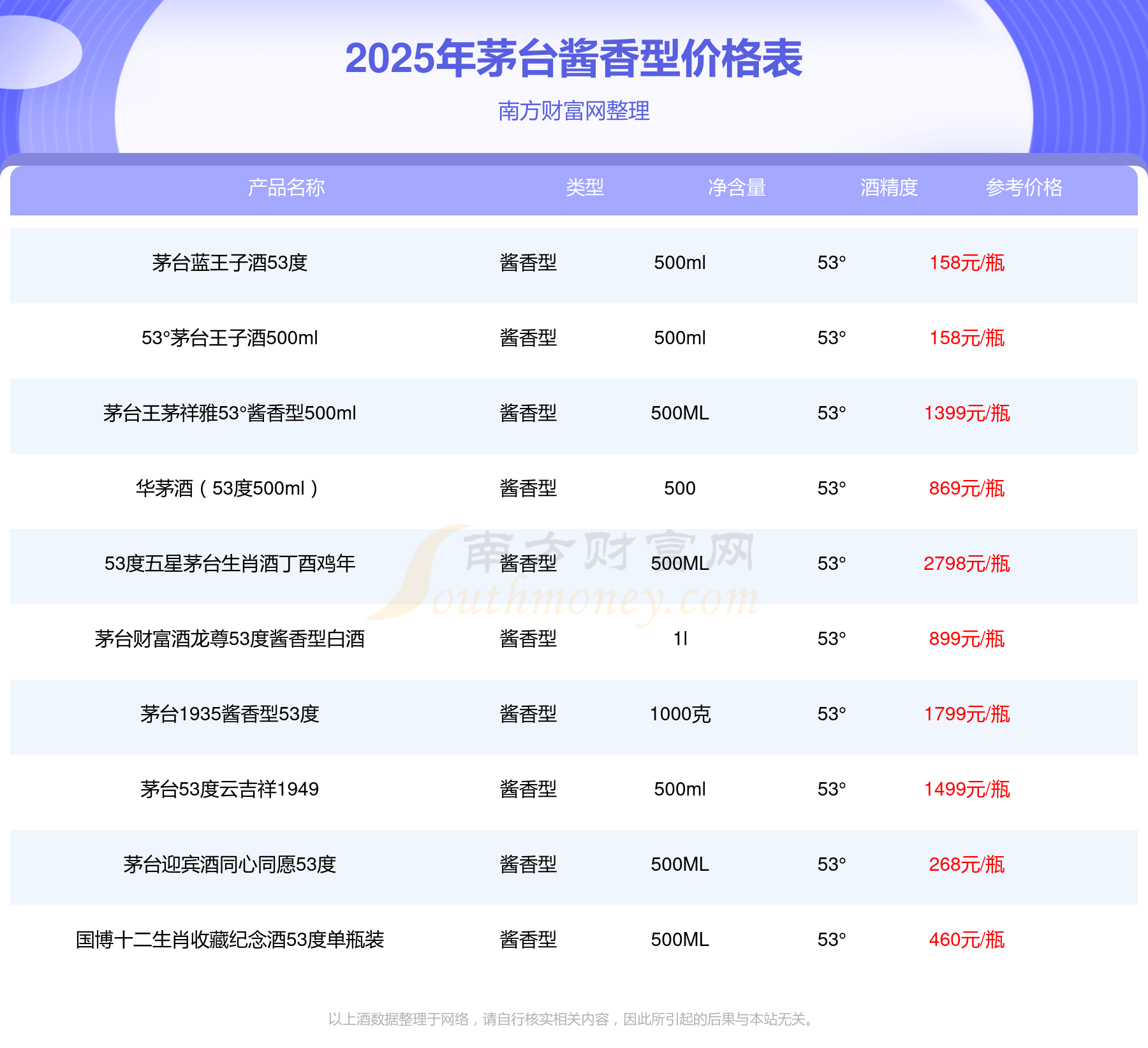 2025年,華茅鑒藏 醬香型白酒 3L 53°、53度五星茅臺(tái)生肖酒丁酉雞年、貴州茅臺(tái)己亥豬年生肖酒53°500ml、53度五星茅臺(tái)生肖酒戊戌狗年、飛天茅臺(tái)53°500ml(2015年)、茅臺(tái)王子酒己亥豬年生肖紀(jì)念酒53度2.5L、茅臺(tái)1935醬香型53度、茅臺(tái)財(cái)富貴賓典藏酒53度等茅臺(tái)醬香型酒價(jià)格如下:華茅鑒藏 醬香型白酒 3L 53°參考價(jià)8388元/瓶、53度五星茅臺(tái)生肖酒丁酉雞年參考價(jià)2798元/瓶、貴州茅臺(tái)己亥豬年生肖酒53°500ml參考價(jià)2699元/瓶、53度五星茅臺(tái)生肖酒戊戌狗年參考價(jià)2698元/瓶、飛天茅臺(tái)53°500ml(2015年)參考價(jià)2199元/瓶、茅臺(tái)王子酒己亥豬年生肖紀(jì)念酒53度2.5L參考價(jià)2099元/瓶、茅臺(tái)1935醬香型53度參考價(jià)1799元/瓶、茅臺(tái)財(cái)富貴賓典藏酒53度參考價(jià)1599元/瓶。
