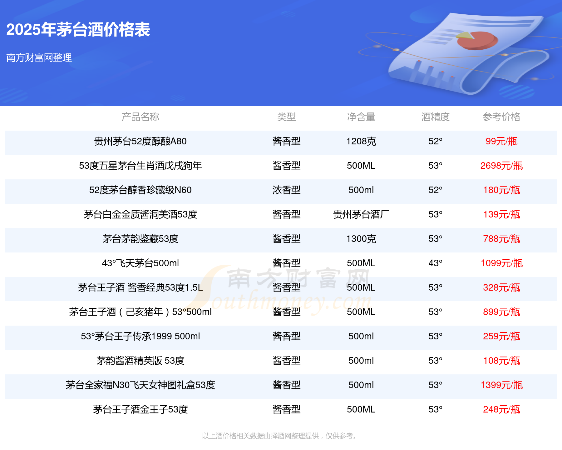 2025年茅臺價(jià)格最高的酒是華茅鑒藏 醬香型白酒 3L 53°,參考價(jià)8388元/瓶,最低的是張義齋52度原漿老窖酒,參考價(jià)58元/瓶,價(jià)格高低差為8330元/瓶。