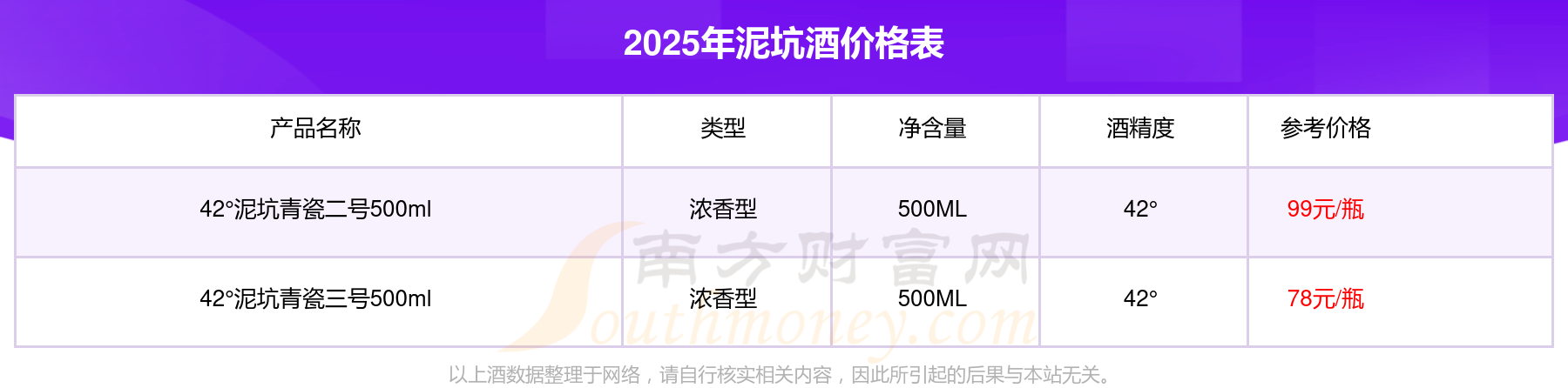 42°泥坑青瓷二號500ml參考價99元/瓶、42°泥坑青瓷三號500ml參考價78元/瓶。