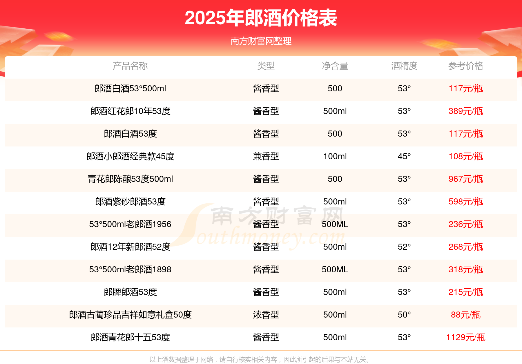 郎酒最新價格2025:郎酒青花郎十五53度參考價1129元/瓶、青花郎陳釀53度500ml參考價967元/瓶、郎酒紫砂郎酒53度參考價598元/瓶、郎酒紅花郎10年53度參考價389元/瓶、53°500ml老郎酒1898參考價318元/瓶、郎酒12年新郎酒52度參考價268元/瓶、53°500ml老郎酒1956參考價236元/瓶。