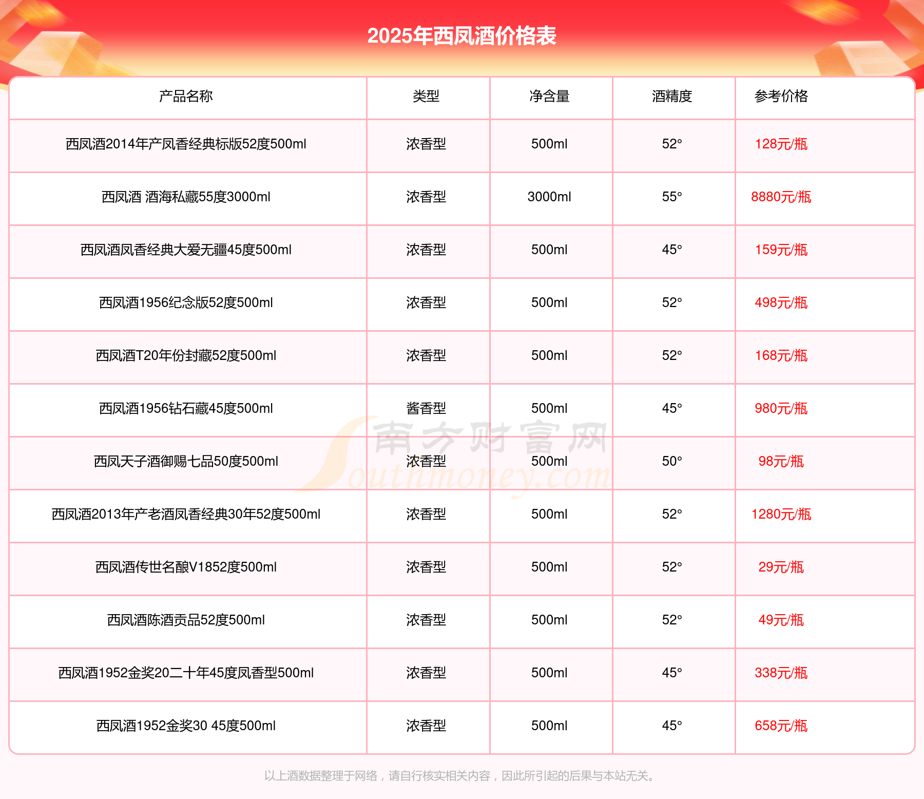 西鳳酒最新價(jià)格2025:西鳳酒 酒海私藏55度3000ml參考價(jià)8880元/瓶、西鳳酒1952金獎(jiǎng)50 55度500ml參考價(jià)2380元/瓶、西鳳酒2013年產(chǎn)老酒鳳香經(jīng)典30年52度500ml參考價(jià)1280元/瓶、西鳳酒1956鉆石藏45度500ml參考價(jià)980元/瓶、西鳳酒1952金獎(jiǎng)30 55度500ml參考價(jià)898元/瓶、西鳳酒鳳香經(jīng)典20年52度500ml參考價(jià)768元/瓶。