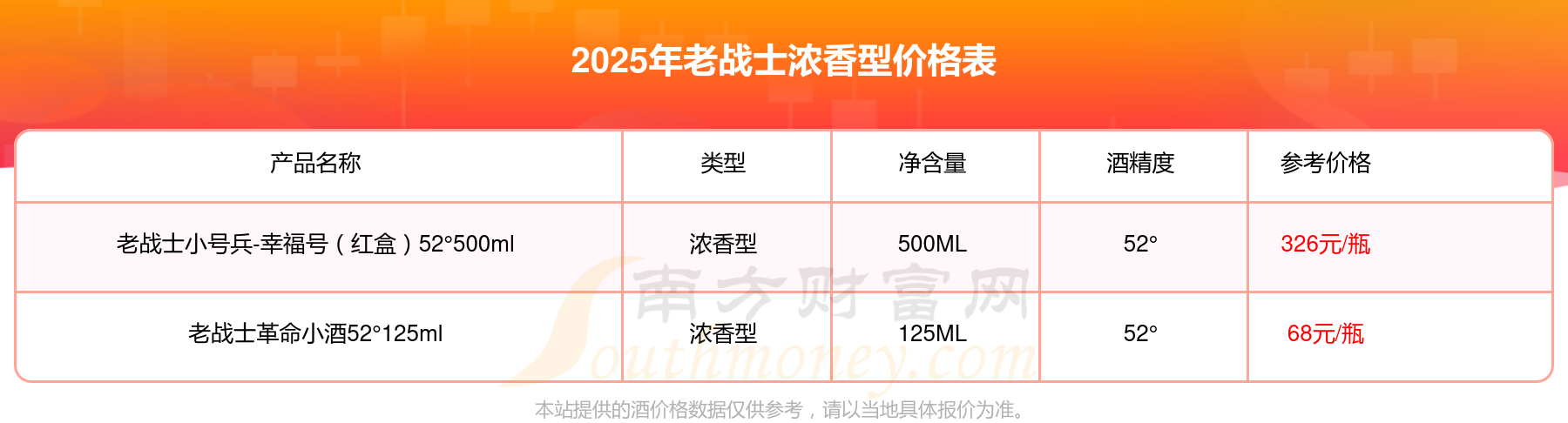 老戰(zhàn)士小號兵-幸福號(紅盒)52°500ml參考價326元/瓶、老戰(zhàn)士革命小酒52°125ml參考價68元/瓶。