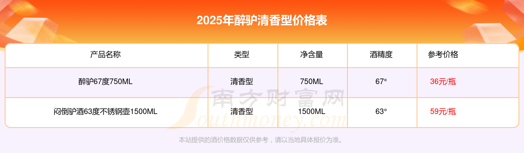 2025年醉驢清香型價格最高的酒是悶倒驢酒63度不銹鋼壺1500ML,參考價59元/瓶,最低的是醉驢67度750ML,參考價36元/瓶,價格高低差為23元/瓶。
