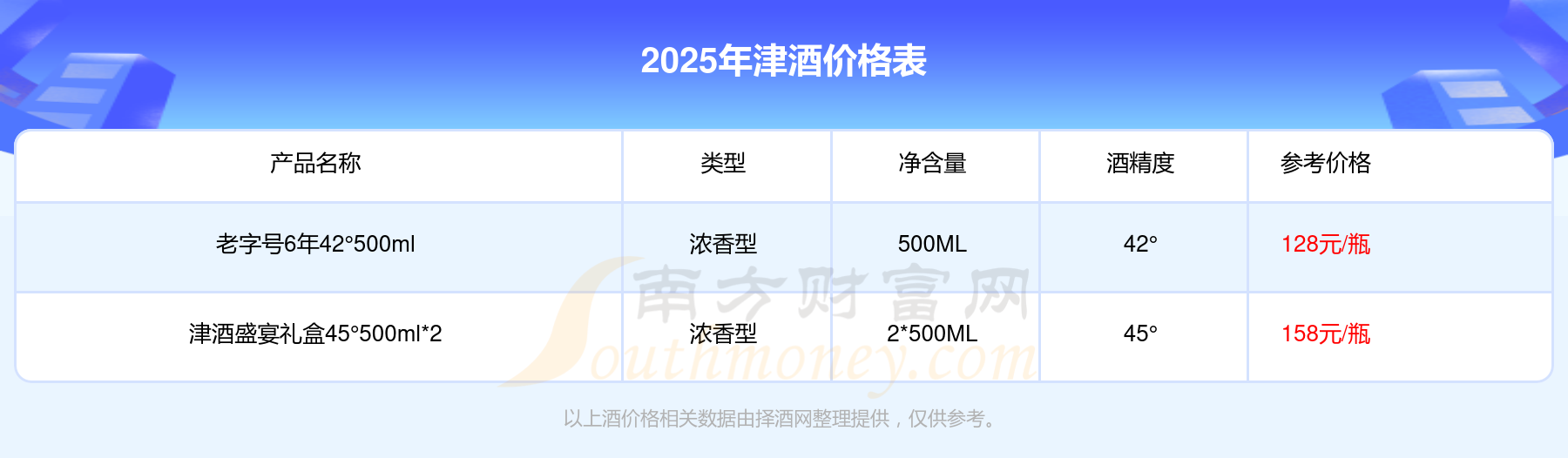 津酒盛宴禮盒45°500ml*2參考價(jià)158元/瓶、老字號(hào)6年42°500ml參考價(jià)128元/瓶。