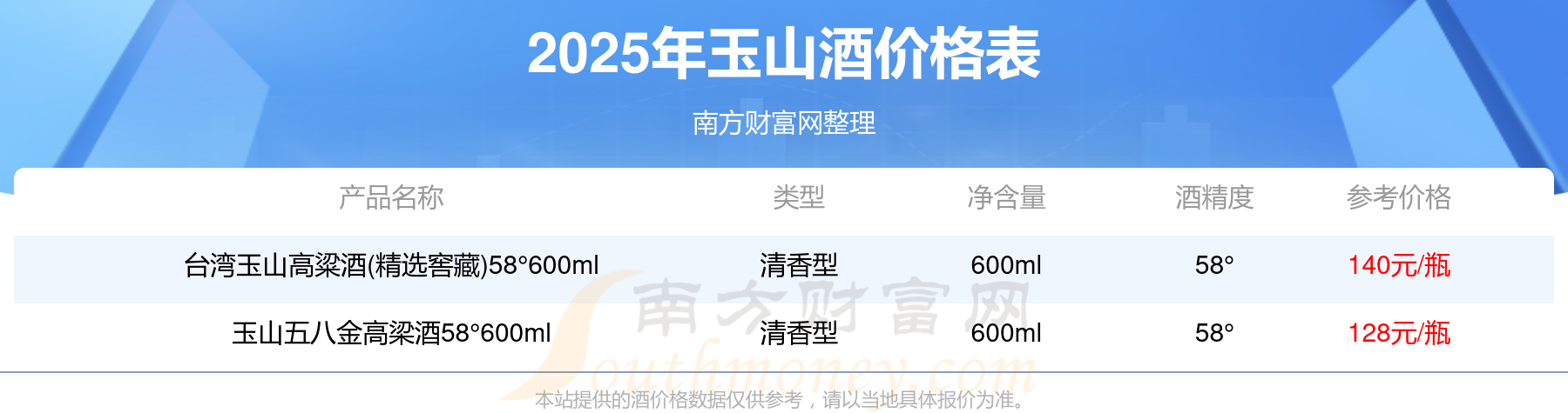 臺(tái)灣玉山高粱酒(精選窖藏)58°600ml參考價(jià)140元/瓶、玉山五八金高梁酒58°600ml參考價(jià)128元/瓶。