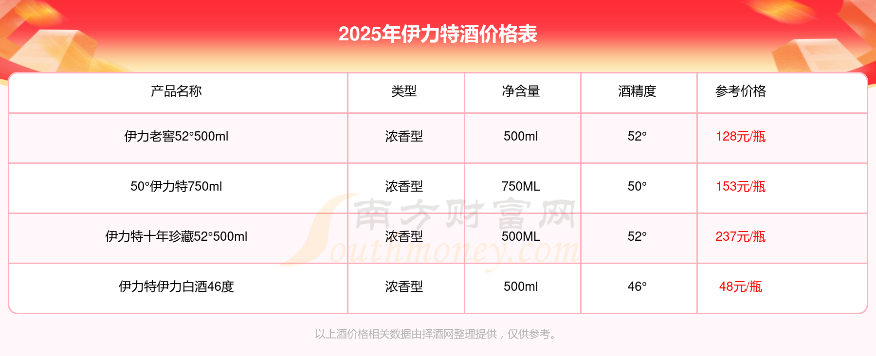 伊力特十年珍藏52°500ml參考價237元/瓶、50°伊力特750ml參考價153元/瓶、伊力老窖52°500ml參考價128元/瓶、伊力特伊力白酒46度參考價48元/瓶。