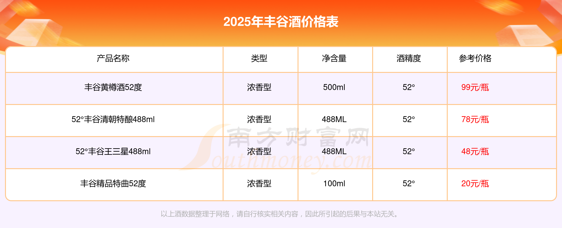 2025豐谷酒最新價格:豐谷黃樽酒52度參考價99元/瓶、52°豐谷清朝特釀488ml參考價78元/瓶、52°豐谷王三星488ml參考價48元/瓶。