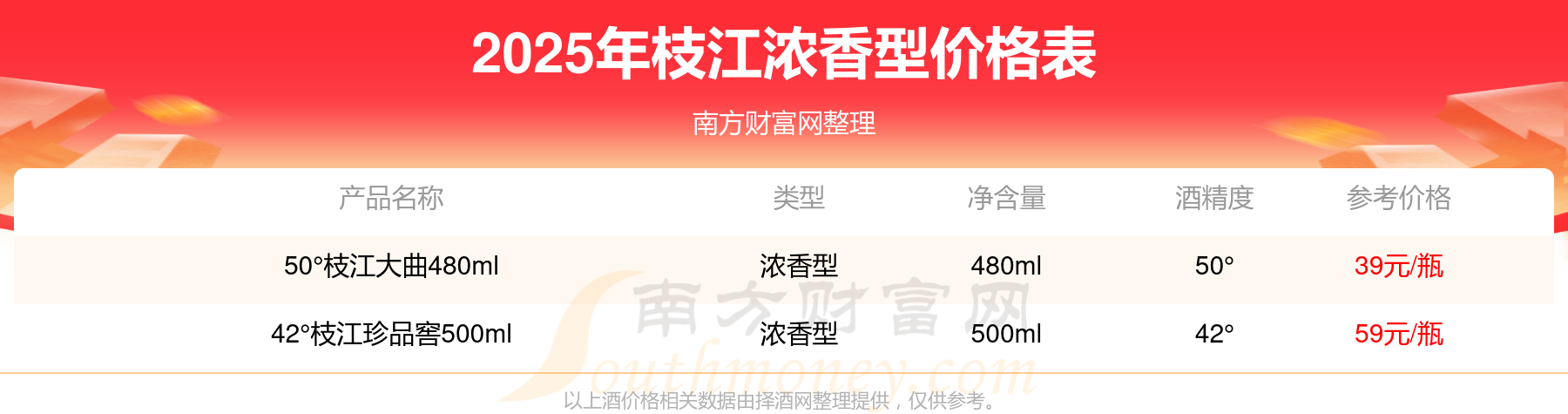2025年,42°枝江珍品窖500ml、50°枝江大曲480ml等枝江濃香型酒價格如下:42°枝江珍品窖500ml參考價59元/瓶、50°枝江大曲480ml參考價39元/瓶。