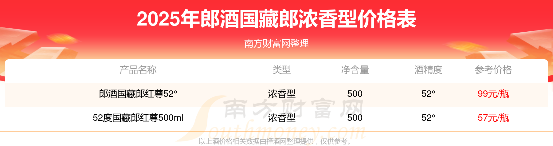 郎酒國(guó)藏郎紅尊52°參考價(jià)99元/瓶、52度國(guó)藏郎紅尊500ml參考價(jià)57元/瓶。