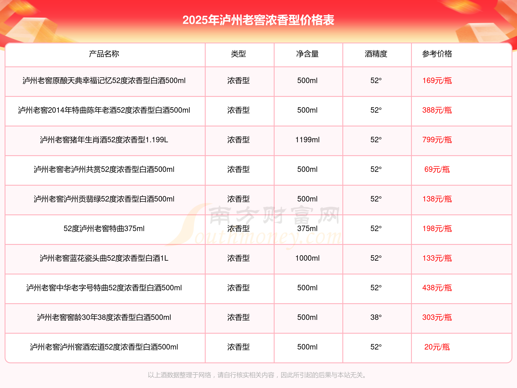 2025年瀘州老窖濃香型酒瀘州老窖國(guó)窖1573春釀鼠兆豐年E 55度、瀘州老窖國(guó)窖1573生命中的那壇酒55度014、瀘州老窖國(guó)窖1573春釀鼠兆豐年A 55度、瀘州老窖國(guó)窖1573生命中的那壇酒55度013濃香型白酒1000ml、瀘州老窖國(guó)窖1573生命中的那壇酒55度009 1000ml、瀘州老窖國(guó)窖1573中國(guó)品味52度濃香型白酒500ml、瀘州老窖國(guó)窖1573許燎源概念作品58度濃香型白酒1000ml等最新價(jià)格如下:瀘州老窖國(guó)窖1573春釀鼠兆豐年E 55度參考價(jià)17999元/瓶、瀘州老窖國(guó)窖1573生命中的那壇酒55度014參考價(jià)9999元/瓶、瀘州老窖國(guó)窖1573春釀鼠兆豐年A 55度參考價(jià)5088元/瓶、瀘州老窖國(guó)窖1573生命中的那壇酒55度013濃香型白酒1000ml參考價(jià)4988元/瓶、瀘州老窖國(guó)窖1573生命中的那壇酒55度009 1000ml參考價(jià)4288元/瓶、瀘州老窖國(guó)窖1573中國(guó)品味52度濃香型白酒500ml參考價(jià)2888元/瓶、瀘州老窖國(guó)窖1573許燎源概念作品58度濃香型白酒1000ml參考價(jià)2680元/瓶。