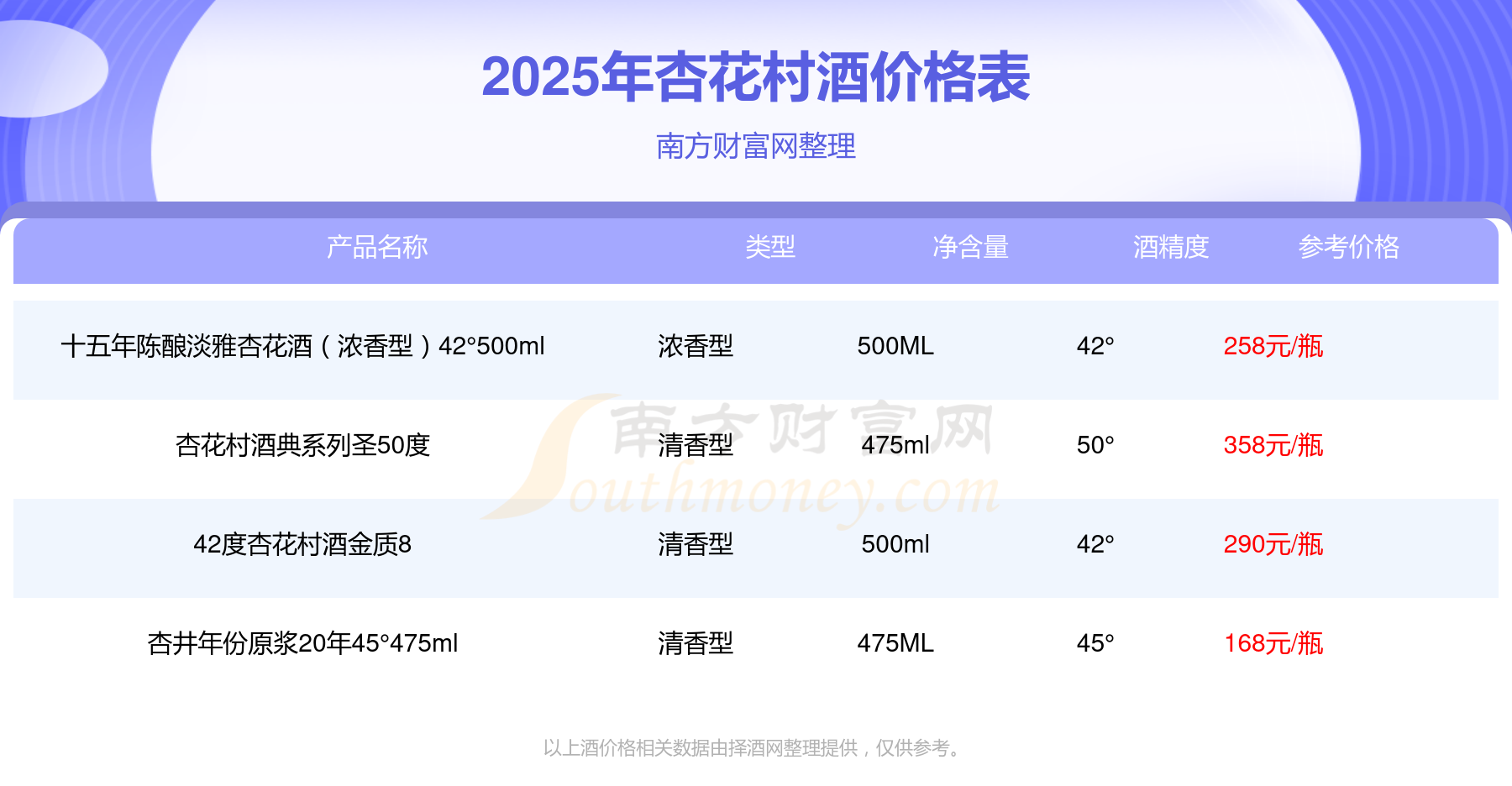 杏花村酒典系列圣50度參考價(jià)358元/瓶、42度杏花村酒金質(zhì)8參考價(jià)290元/瓶、十五年陳釀淡雅杏花酒(濃香型)42°500ml參考價(jià)258元/瓶、杏井年份原漿20年45°475ml參考價(jià)168元/瓶。