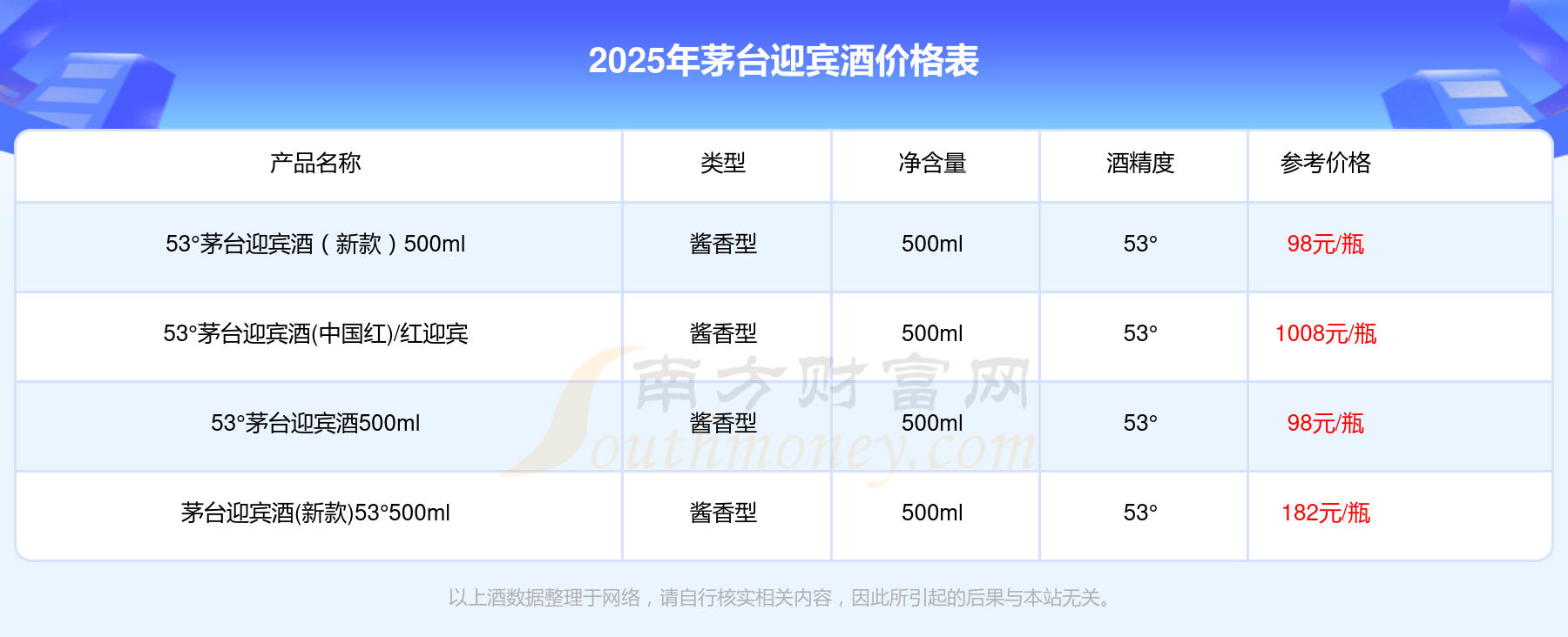 53°茅臺迎賓酒(中國紅)/紅迎賓參考價1008元/瓶、茅臺迎賓酒(新款)53°500ml參考價182元/瓶、53°茅臺迎賓酒(新款)500ml參考價98元/瓶、53°茅臺迎賓酒500ml參考價98元/瓶。