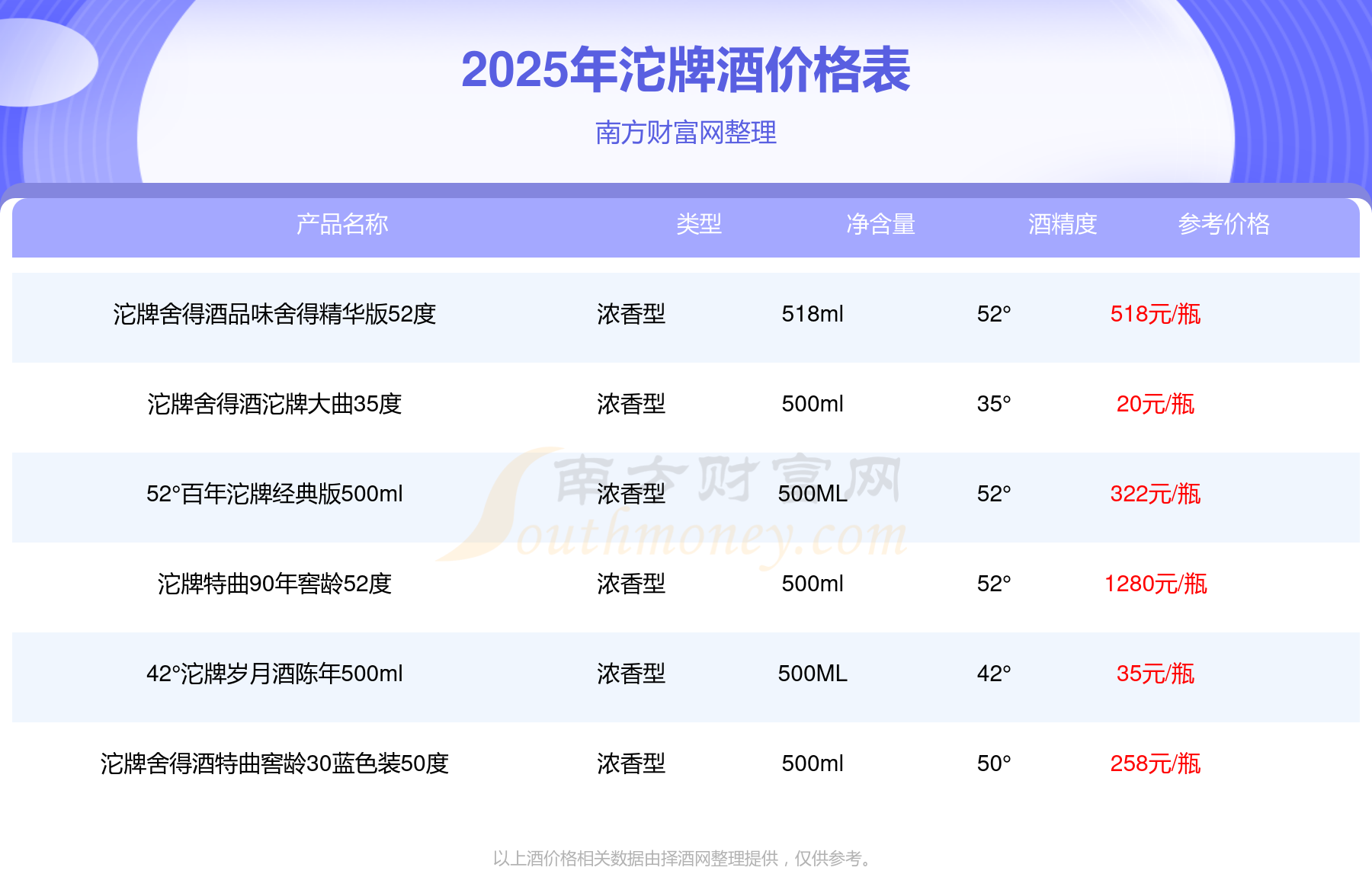 2025年,沱牌特曲90年窖齡52度、沱牌舍得酒品味舍得精華版52度、52°百年沱牌經(jīng)典版500ml、沱牌舍得酒特曲窖齡30藍色裝50度、42°沱牌歲月酒陳年500ml、沱牌舍得酒沱牌大曲35度等沱牌酒價格如下:沱牌特曲90年窖齡52度參考價1280元/瓶、沱牌舍得酒品味舍得精華版52度參考價518元/瓶、52°百年沱牌經(jīng)典版500ml參考價322元/瓶、沱牌舍得酒特曲窖齡30藍色裝50度參考價258元/瓶、42°沱牌歲月酒陳年500ml參考價35元/瓶、沱牌舍得酒沱牌大曲35度參考價20元/瓶。