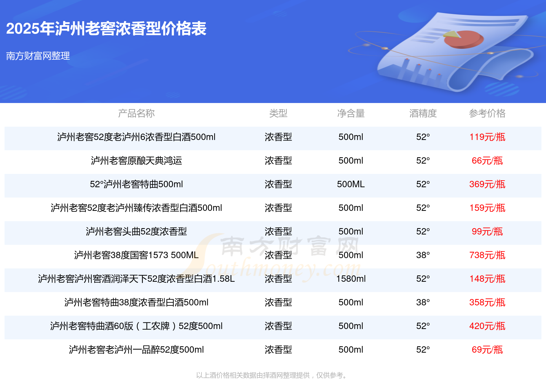 瀘州老窖濃香型酒最新價(jià)格2025:瀘州老窖國窖1573春釀鼠兆豐年E 55度參考價(jià)17999元/瓶、瀘州老窖國窖1573生命中的那壇酒55度014參考價(jià)9999元/瓶、瀘州老窖國窖1573春釀鼠兆豐年A 55度參考價(jià)5088元/瓶、瀘州老窖國窖1573生命中的那壇酒55度013濃香型白酒1000ml參考價(jià)4988元/瓶、瀘州老窖國窖1573生命中的那壇酒55度009 1000ml參考價(jià)4288元/瓶、瀘州老窖國窖1573中國品味52度濃香型白酒500ml參考價(jià)2888元/瓶、瀘州老窖國窖1573許燎源概念作品58度濃香型白酒1000ml參考價(jià)2680元/瓶。