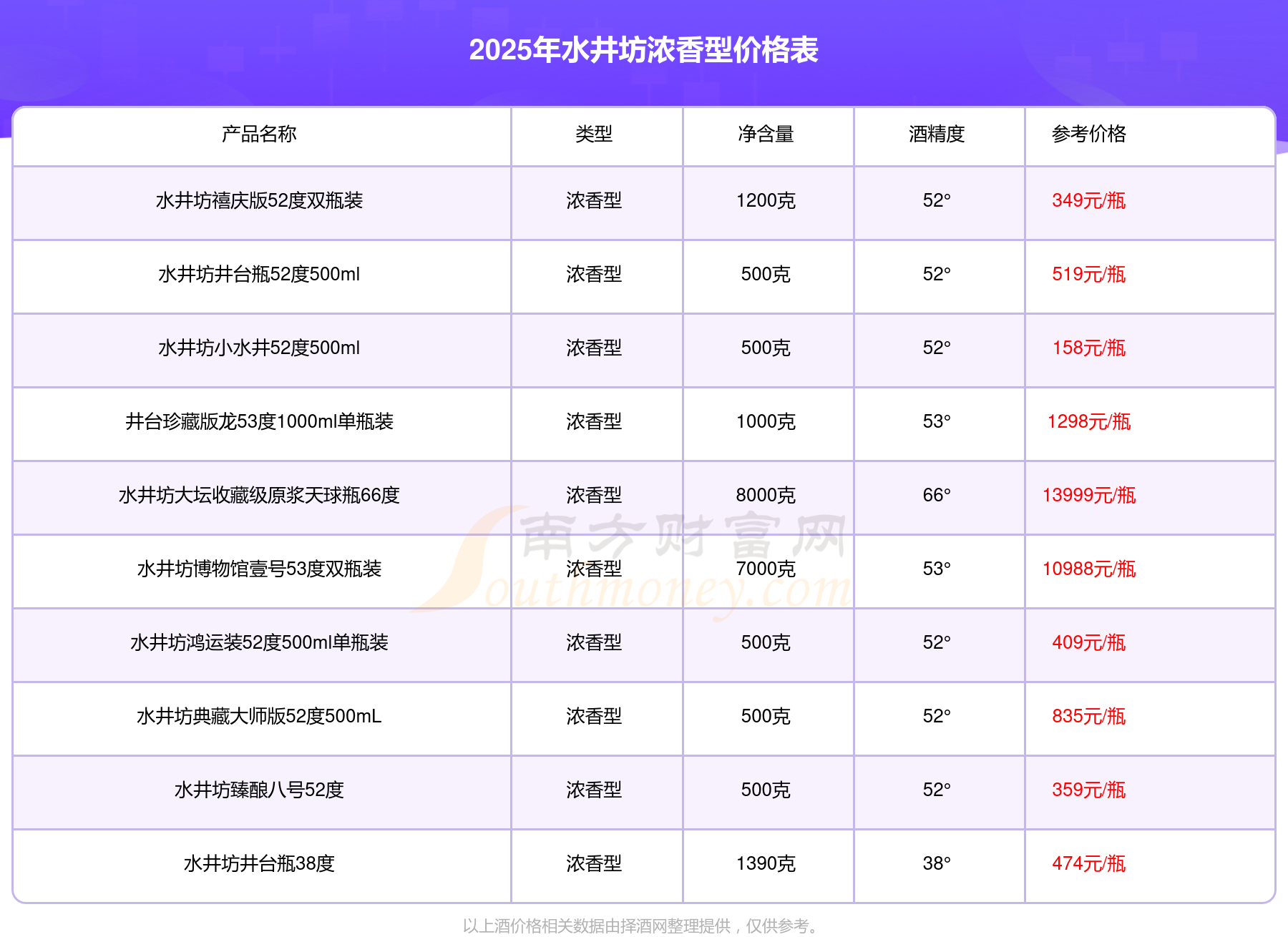 水井坊濃香型酒最新價格2025:水井坊大壇收藏級原漿天球瓶66度參考價13999元/瓶、水井坊博物館壹號53度雙瓶裝參考價10988元/瓶、53°水井坊公元十三600ml參考價2580元/瓶、水井坊梅蘭竹菊52度濃香型600ml4瓶參考價1999元/瓶、水井坊菁翠52度500ml參考價1650元/瓶、井臺珍藏版龍53度1000ml單瓶裝參考價1298元/瓶、井臺珍藏版鳳53度1000ml單瓶裝參考價1298元/瓶、53°水晶水井坊500ml參考價898元/瓶。