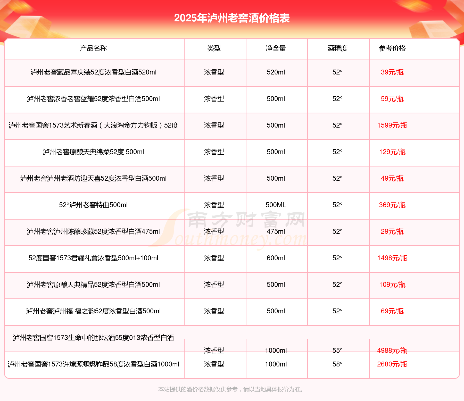 瀘州老窖國(guó)窖1573春釀鼠兆豐年E 55度參考價(jià)17999元/瓶、瀘州老窖國(guó)窖1573生命中的那壇酒55度014參考價(jià)9999元/瓶、瀘州老窖國(guó)窖1573春釀鼠兆豐年A 55度參考價(jià)5088元/瓶、瀘州老窖國(guó)窖1573生命中的那壇酒55度013濃香型白酒1000ml參考價(jià)4988元/瓶、瀘州老窖國(guó)窖1573生命中的那壇酒55度009 1000ml參考價(jià)4288元/瓶、瀘州老窖國(guó)窖1573中國(guó)品味52度濃香型白酒500ml參考價(jià)2888元/瓶、瀘州老窖國(guó)窖1573許燎源概念作品58度濃香型白酒1000ml參考價(jià)2680元/瓶。