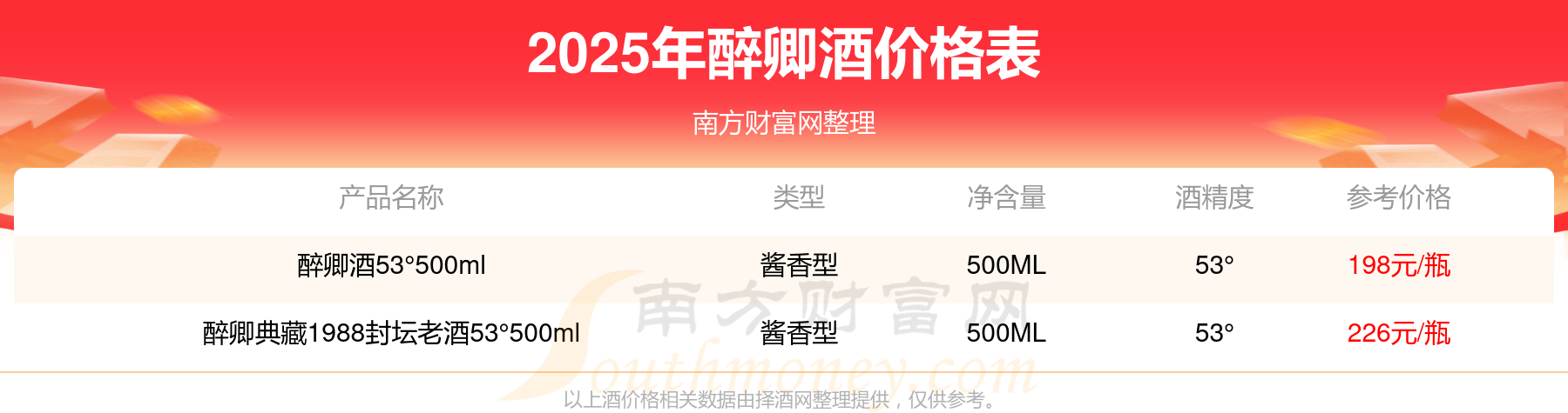 醉卿典藏1988封壇老酒53°500ml參考價(jià)226元/瓶、醉卿酒53°500ml參考價(jià)198元/瓶。