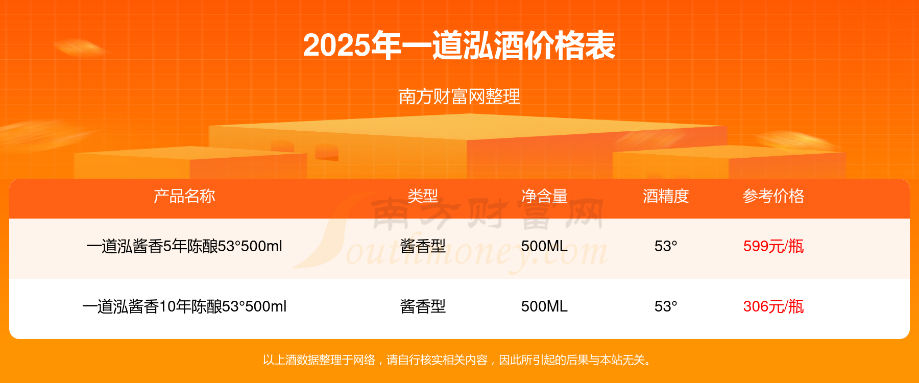 2025年,一道泓酒價(jià)格最高的是一道泓醬香5年陳釀53°500ml,參考價(jià)599元,最低的是一道泓醬香10年陳釀53°500ml,參考價(jià)306元,價(jià)格高低差為293元。
