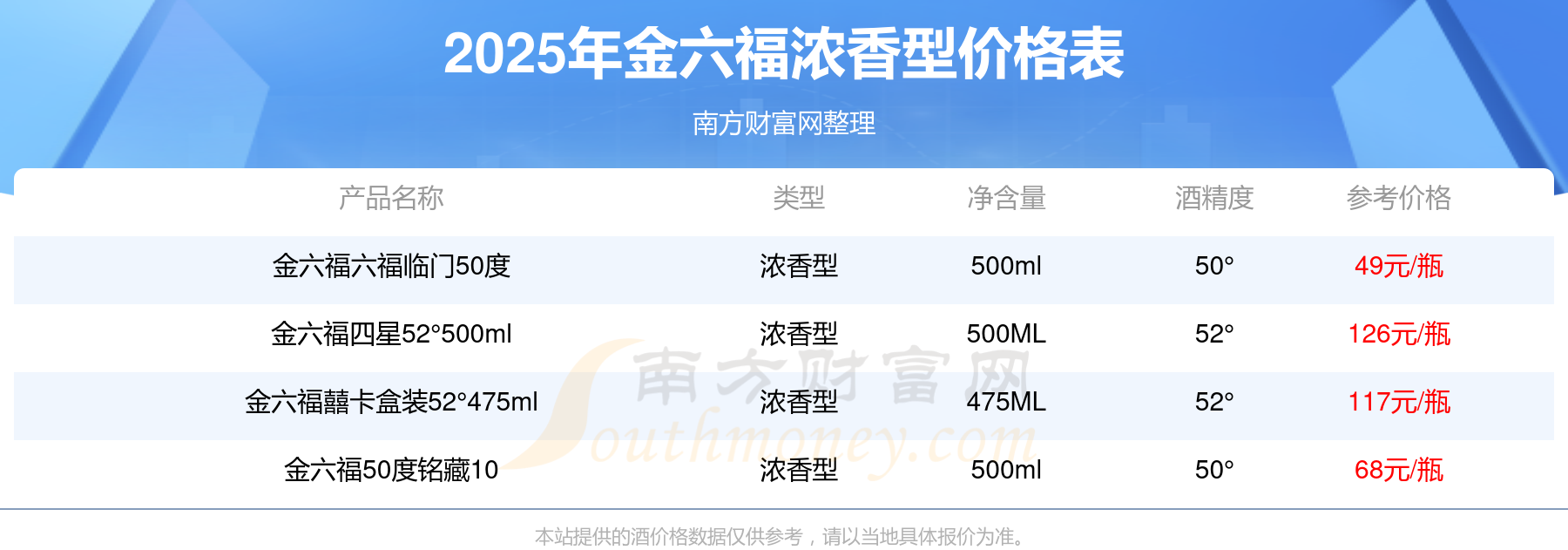 2025年金六福濃香型酒金六福四星52°500ml、金六福囍卡盒裝52°475ml、金六福50度銘藏10、金六福六福臨門50度等最新價(jià)格如下:金六福四星52°500ml參考價(jià)126元/瓶、金六福囍卡盒裝52°475ml參考價(jià)117元/瓶、金六福50度銘藏10參考價(jià)68元/瓶、金六福六福臨門50度參考價(jià)49元/瓶。