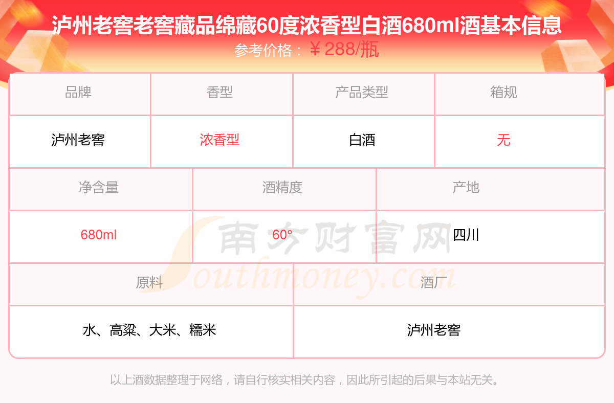 瀘州老窖老窖藏品綿藏60度濃香型白酒680ml基本信息