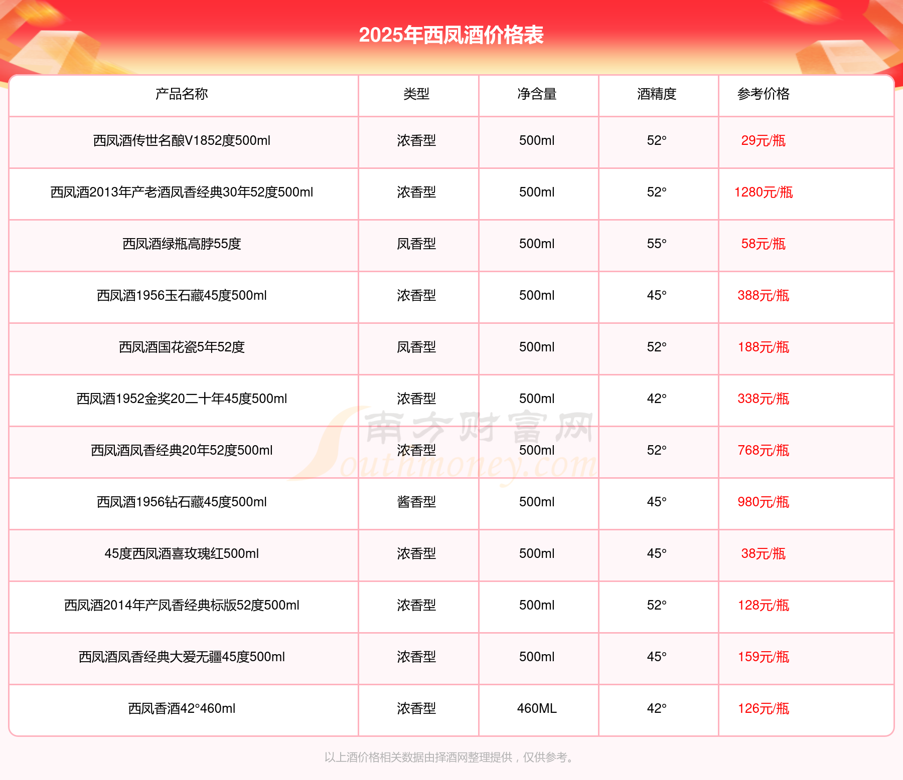 西鳳酒 酒海私藏55度3000ml參考價(jià)8880元/瓶、西鳳酒1952金獎(jiǎng)50 55度500ml參考價(jià)2380元/瓶、西鳳酒2013年產(chǎn)老酒鳳香經(jīng)典30年52度500ml參考價(jià)1280元/瓶、西鳳酒1956鉆石藏45度500ml參考價(jià)980元/瓶、西鳳酒1952金獎(jiǎng)30 55度500ml參考價(jià)898元/瓶、西鳳酒鳳香經(jīng)典20年52度500ml參考價(jià)768元/瓶、西鳳酒1952金獎(jiǎng)30 45度500ml參考價(jià)658元/瓶、西鳳酒1956紀(jì)念版52度500ml參考價(jià)498元/瓶。