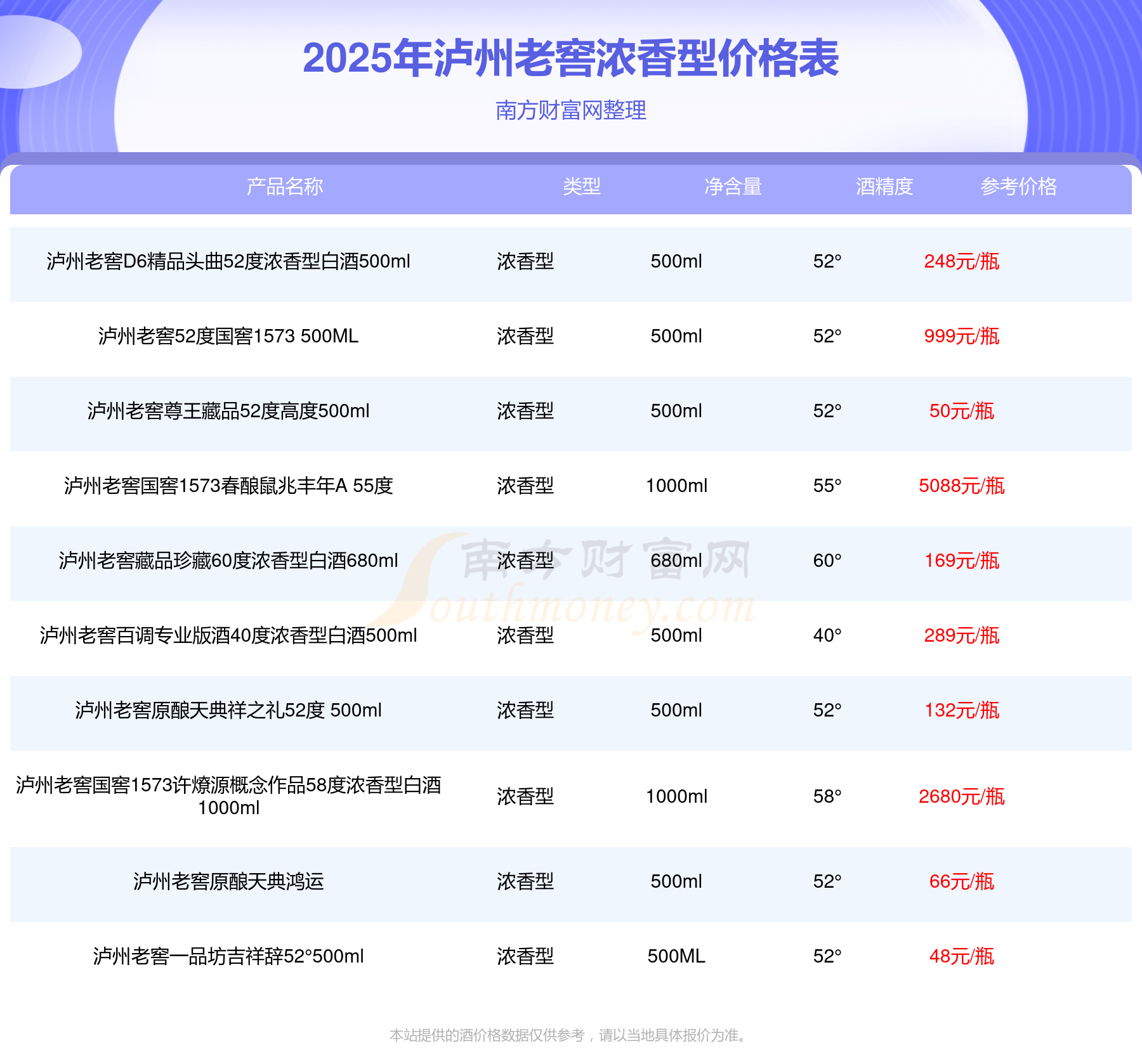 2025年瀘州老窖濃香型酒瀘州老窖國窖1573春釀鼠兆豐年E 55度、瀘州老窖國窖1573生命中的那壇酒55度014、瀘州老窖國窖1573春釀鼠兆豐年A 55度、瀘州老窖國窖1573生命中的那壇酒55度013濃香型白酒1000ml等最新價格如下:瀘州老窖國窖1573春釀鼠兆豐年E 55度參考價17999元/瓶、瀘州老窖國窖1573生命中的那壇酒55度014參考價9999元/瓶、瀘州老窖國窖1573春釀鼠兆豐年A 55度參考價5088元/瓶、瀘州老窖國窖1573生命中的那壇酒55度013濃香型白酒1000ml參考價4988元/瓶。