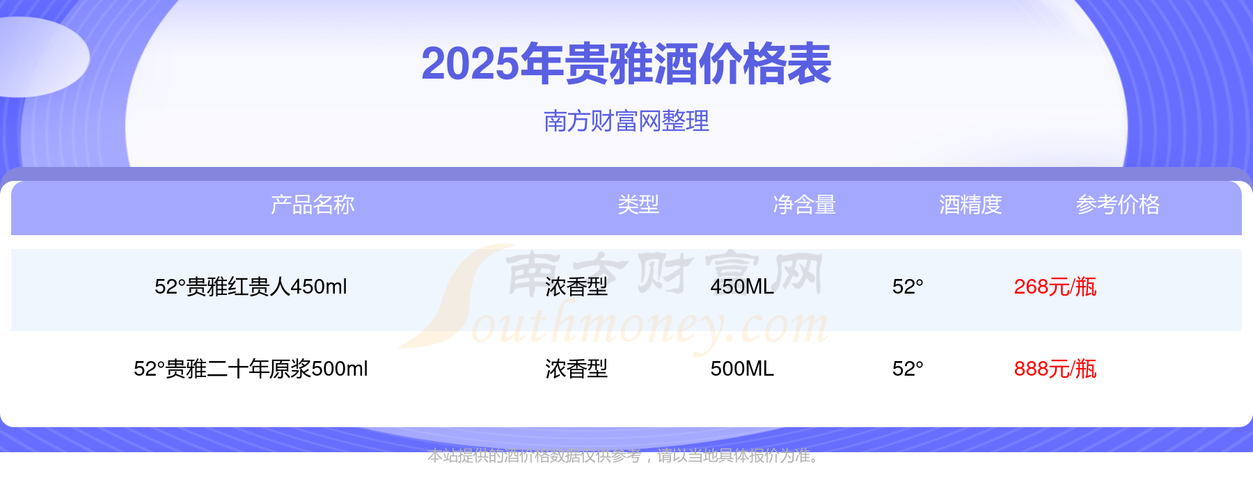 2025年,52°貴雅二十年原漿500ml、52°貴雅紅貴人450ml等貴雅酒價格如下: