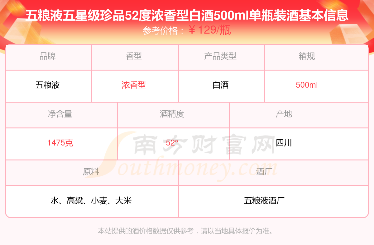 五糧液五星級珍品52度濃香型白酒500ml單瓶裝基本信息