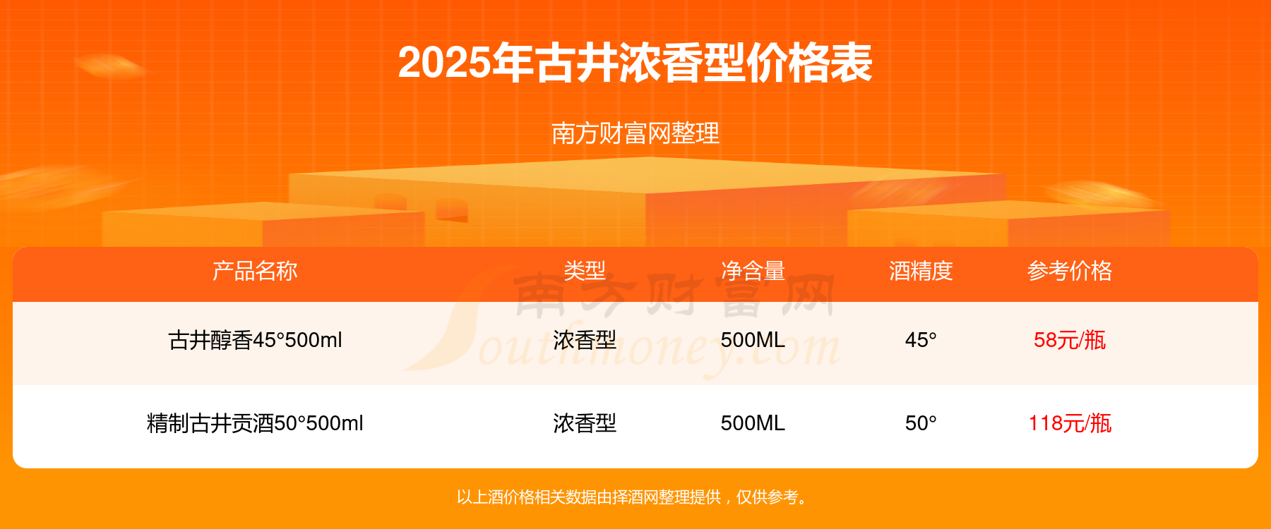 2025年古井濃香型酒精制古井貢酒50°500ml、古井醇香45°500ml等最新價格如下: