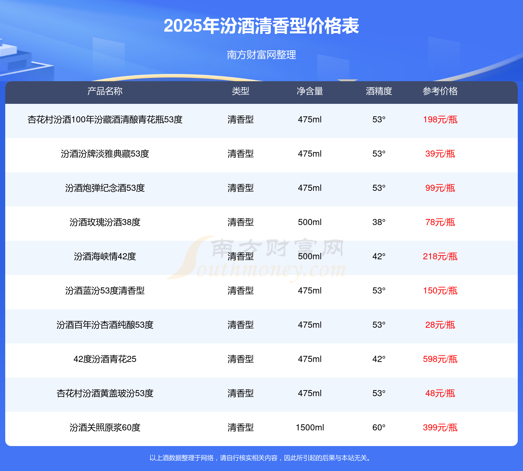 2025年汾酒清香型價格最高的酒是汾酒原漿一壇香60°3000ml,參考價2180元/瓶,最低的是汾酒百年汾杏酒純釀53度,參考價28元/瓶,價格高低差為2152元/瓶。