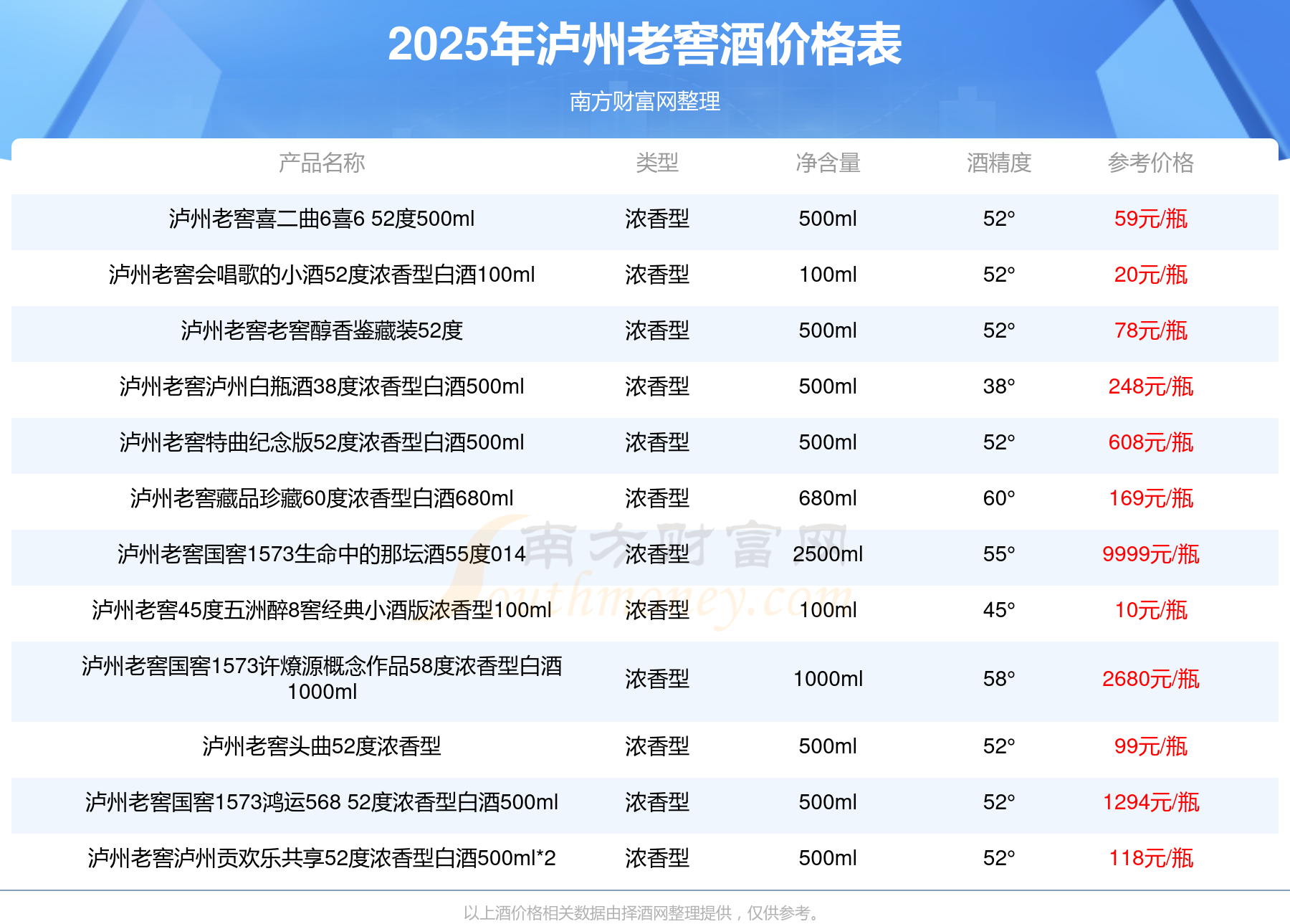 2025年,瀘州老窖國(guó)窖1573春釀鼠兆豐年E 55度、瀘州老窖國(guó)窖1573生命中的那壇酒55度014、瀘州老窖國(guó)窖1573春釀鼠兆豐年A 55度、瀘州老窖國(guó)窖1573生命中的那壇酒55度013濃香型白酒1000ml、瀘州老窖國(guó)窖1573生命中的那壇酒55度009 1000ml、瀘州老窖國(guó)窖1573中國(guó)品味52度濃香型白酒500ml、瀘州老窖國(guó)窖1573許燎源概念作品58度濃香型白酒1000ml等瀘州老窖酒參考價(jià)格如下:瀘州老窖國(guó)窖1573春釀鼠兆豐年E 55度參考價(jià)17999元、瀘州老窖國(guó)窖1573生命中的那壇酒55度014參考價(jià)9999元、瀘州老窖國(guó)窖1573春釀鼠兆豐年A 55度參考價(jià)5088元、瀘州老窖國(guó)窖1573生命中的那壇酒55度013濃香型白酒1000ml參考價(jià)4988元、瀘州老窖國(guó)窖1573生命中的那壇酒55度009 1000ml參考價(jià)4288元、瀘州老窖國(guó)窖1573中國(guó)品味52度濃香型白酒500ml參考價(jià)2888元、瀘州老窖國(guó)窖1573許燎源概念作品58度濃香型白酒1000ml參考價(jià)2680元。