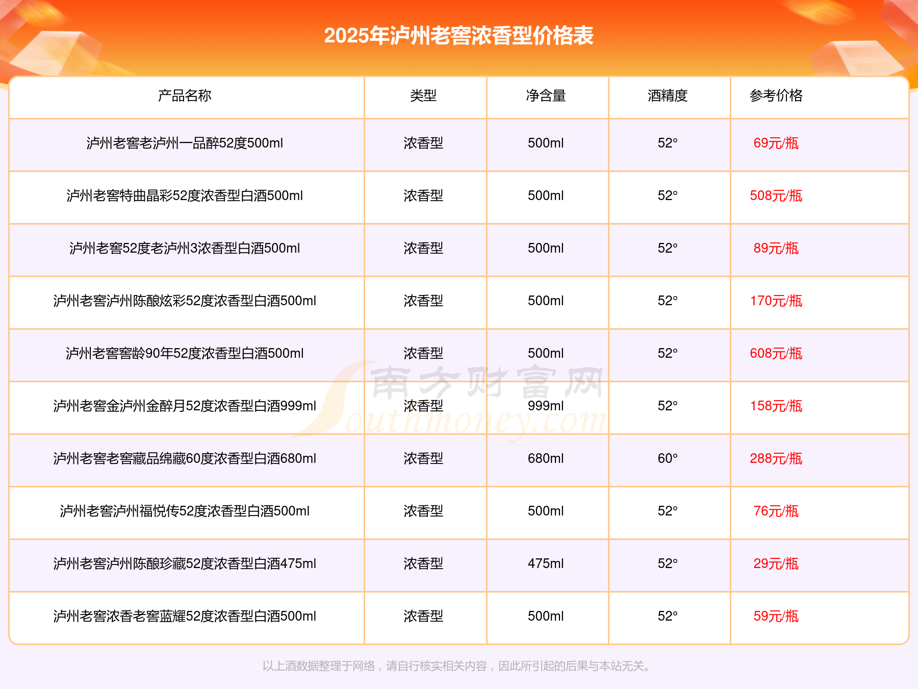 2025年,瀘州老窖濃香型酒價格最高的是瀘州老窖國窖1573春釀鼠兆豐年E 55度,參考價17999元,最低的是瀘州老窖45度五洲醉8窖經(jīng)典小酒版濃香型100ml,參考價10元,價格高低差為17989元。